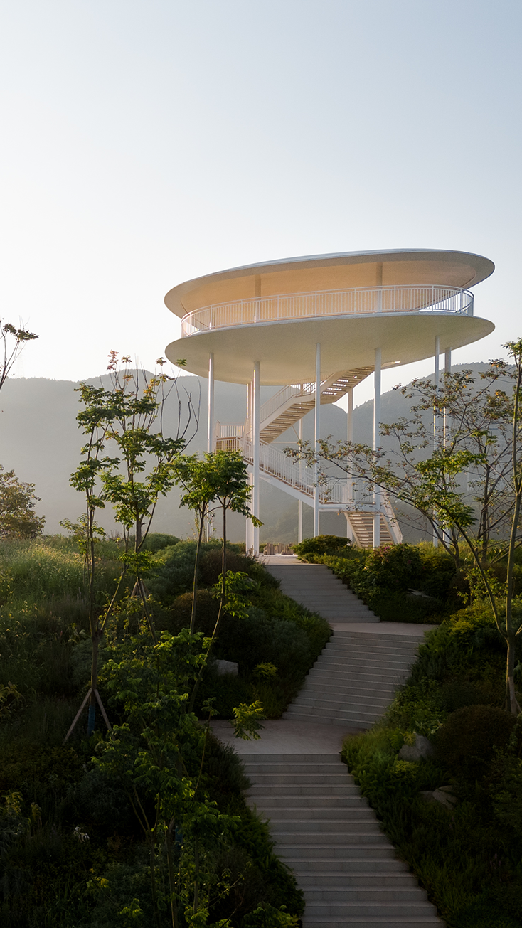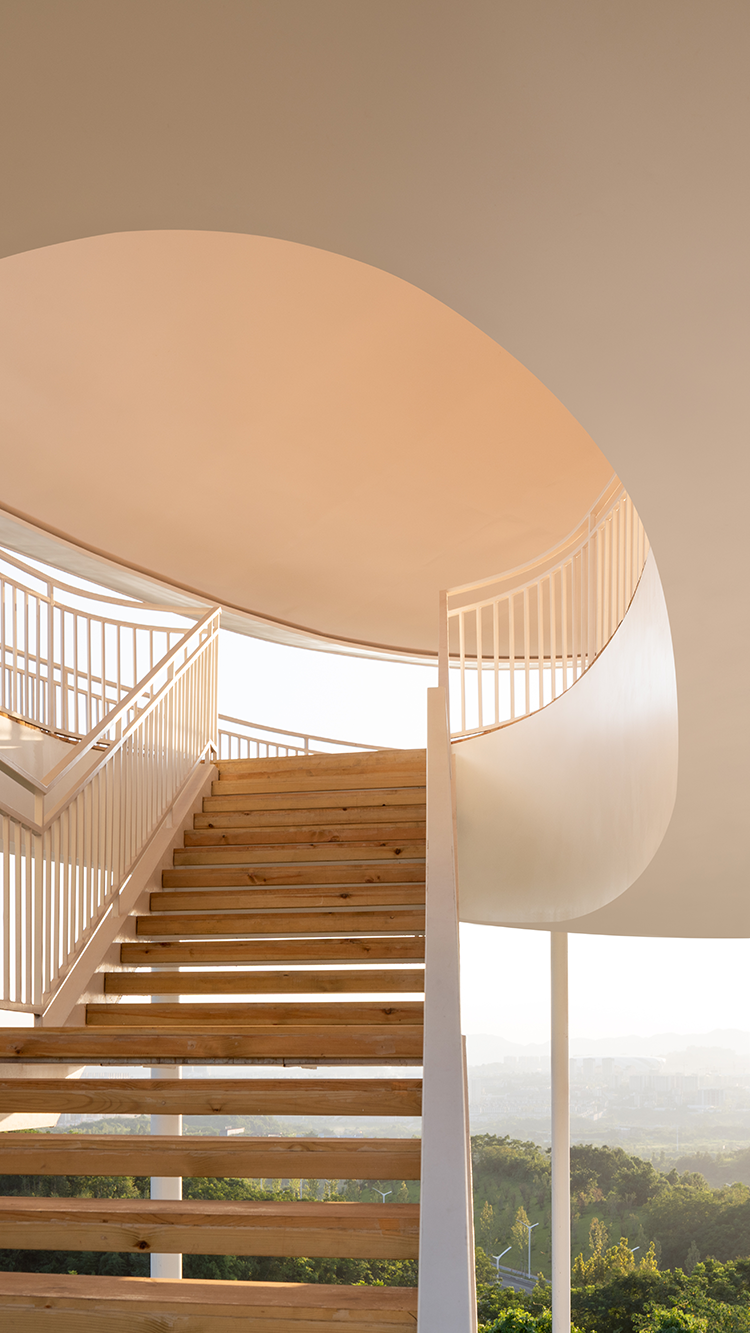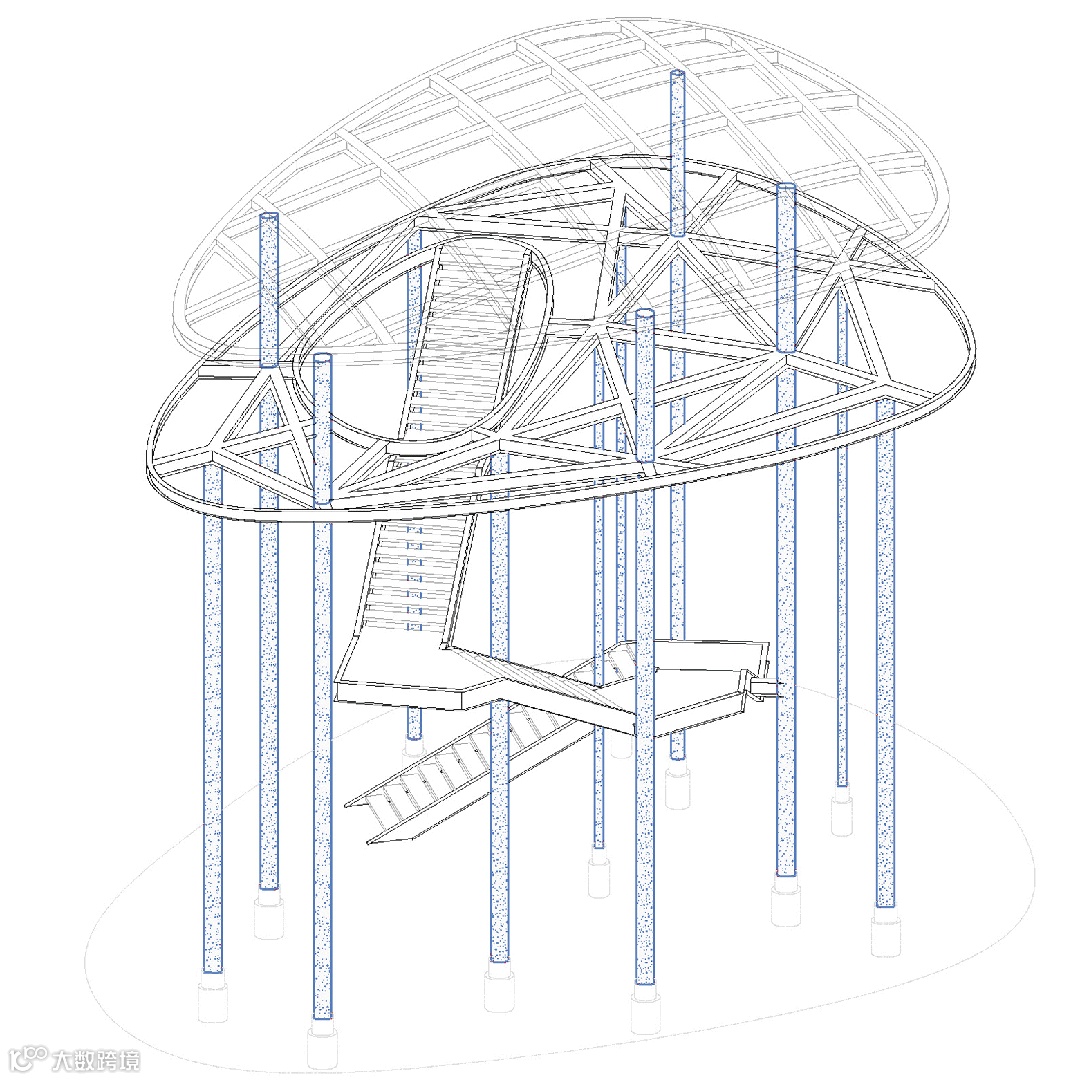 兼顾形态、楼梯路径、结构传力效率等,结构设计以“框架柱+摇摆柱+楼梯斜撑”共同构建项目的支撑体系: