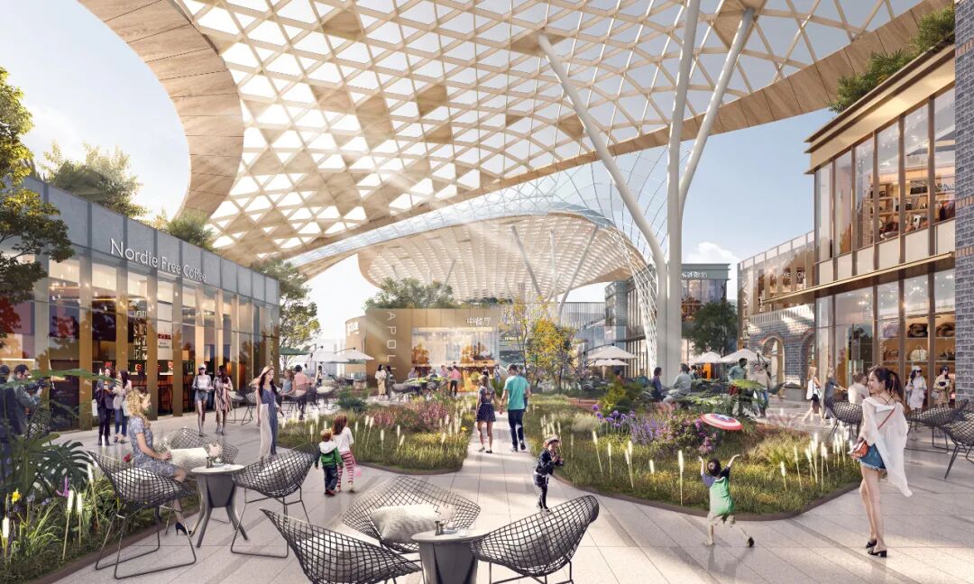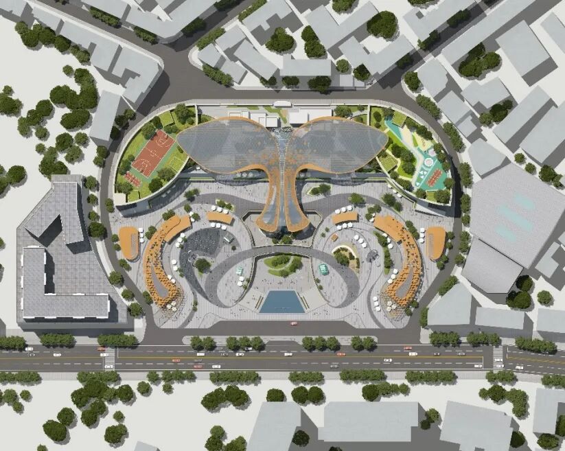本改造项目建筑面积约为4.8万㎡。原主体下部钢筋混凝土框架结构,地上2层(局部4层),建筑功能为商业;地下1层,建筑功能为车库及设备用房。屋顶设置的大跨度连体钢结构天幕,南北向长度约为60m,东西向长度约为110m,天幕为形似蝴蝶的自由曲面。曲面的网格划分为近似空间等边三角形,网格尺寸为2.5m~3.0m。天幕下方间隔一定距离设置树形分叉柱,分叉柱沿天幕中心呈对称布置。
