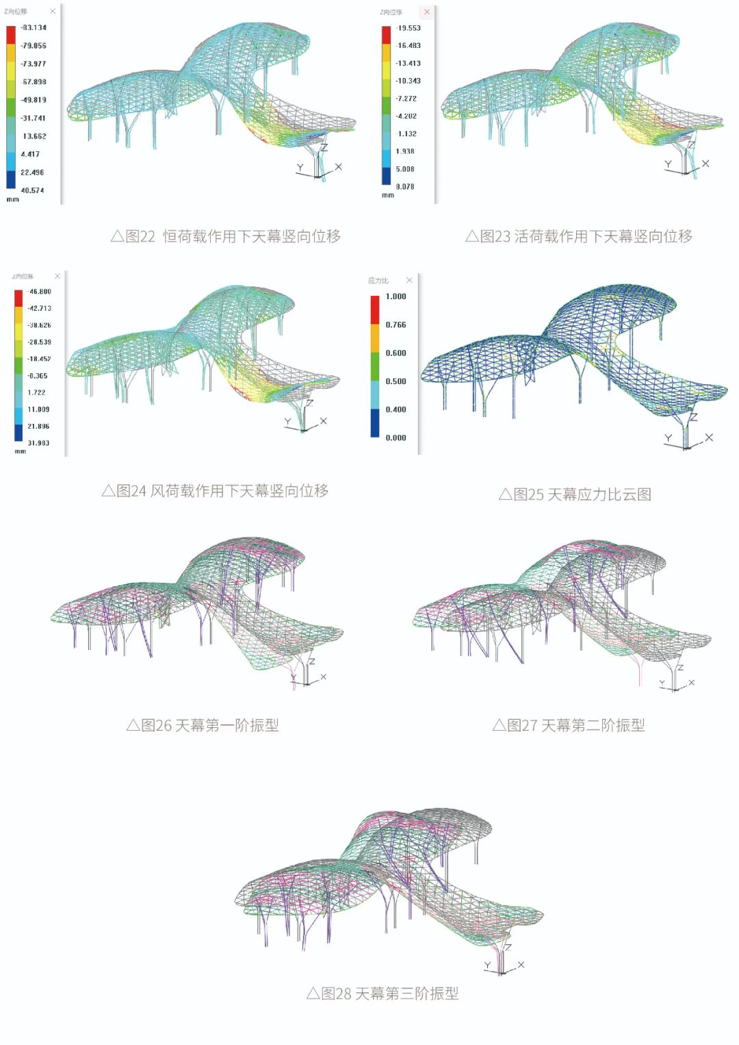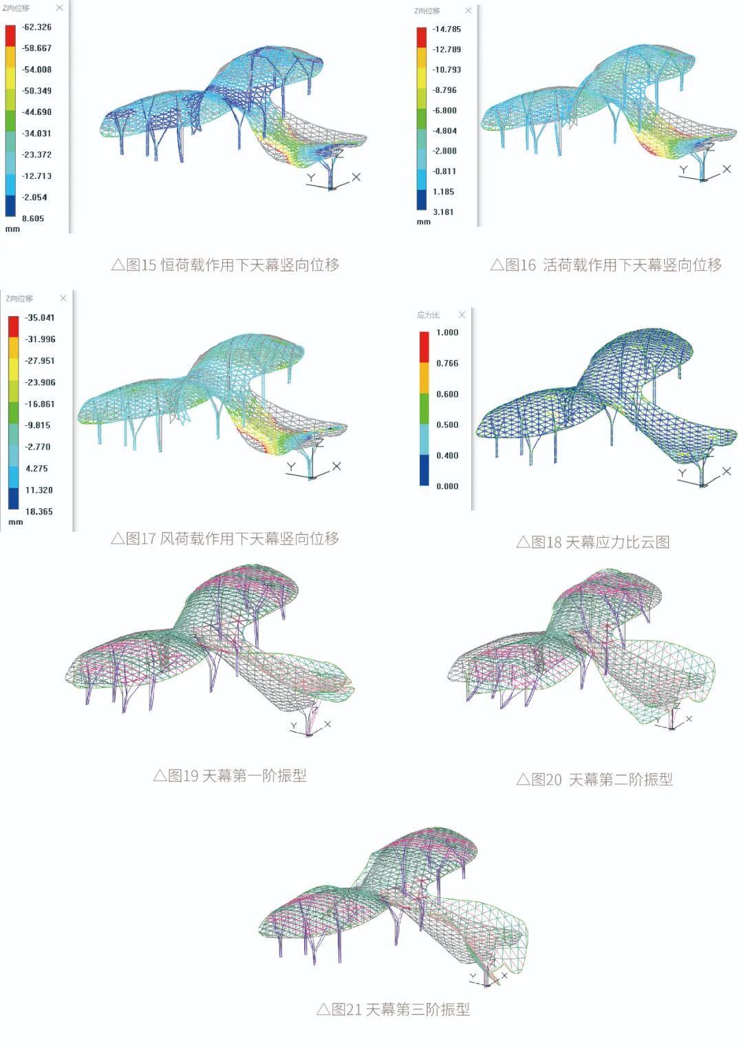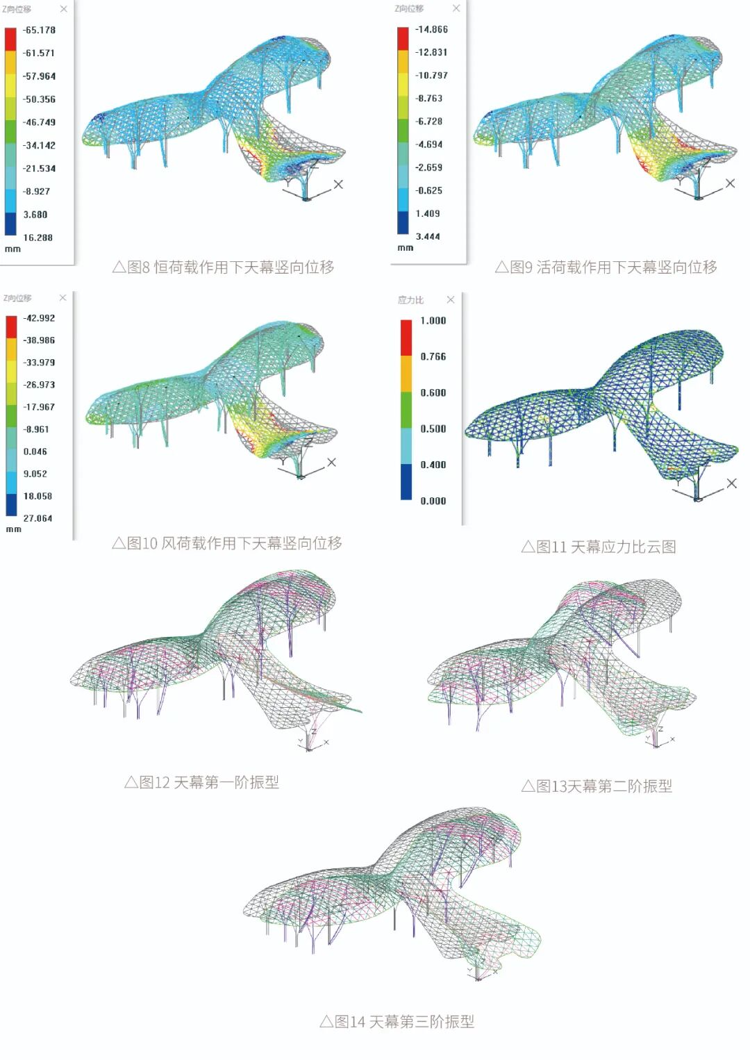荷载取值:(1)恒荷载:自重根据程序自动考虑并沿Z轴负方向;屋面膜及局部铝板0.4kN/m2;(2)不上人屋面活荷载0.5kN/m2;(3)风荷载:根据基本风压计算得到的风荷载和1.0kN/m2两者值取大进行设计;(4)温度作用:南充地区基本气温最高为36℃,最低气温为0℃,因此钢结构天幕温度荷载按照升温40℃、降温28℃进行取值;(5)地震作用:考虑竖向地震,竖向地震影响系数取水平地震影响系数的65%。
