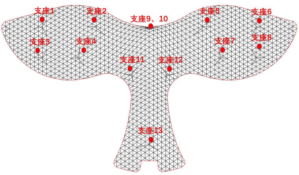 国内大跨度钢结构天幕的研究已经较为广泛,空间钢结构节点的试验和研究也较为深入,但大跨度天幕支撑于不同单体上,且考虑各单体的不同支座的研究还不足,因此本文针对置于四个镜像关系的下部钢筋混凝土的天幕支座情况进行研究,考查不同支座情况下钢结构天幕的内力及受力性能。