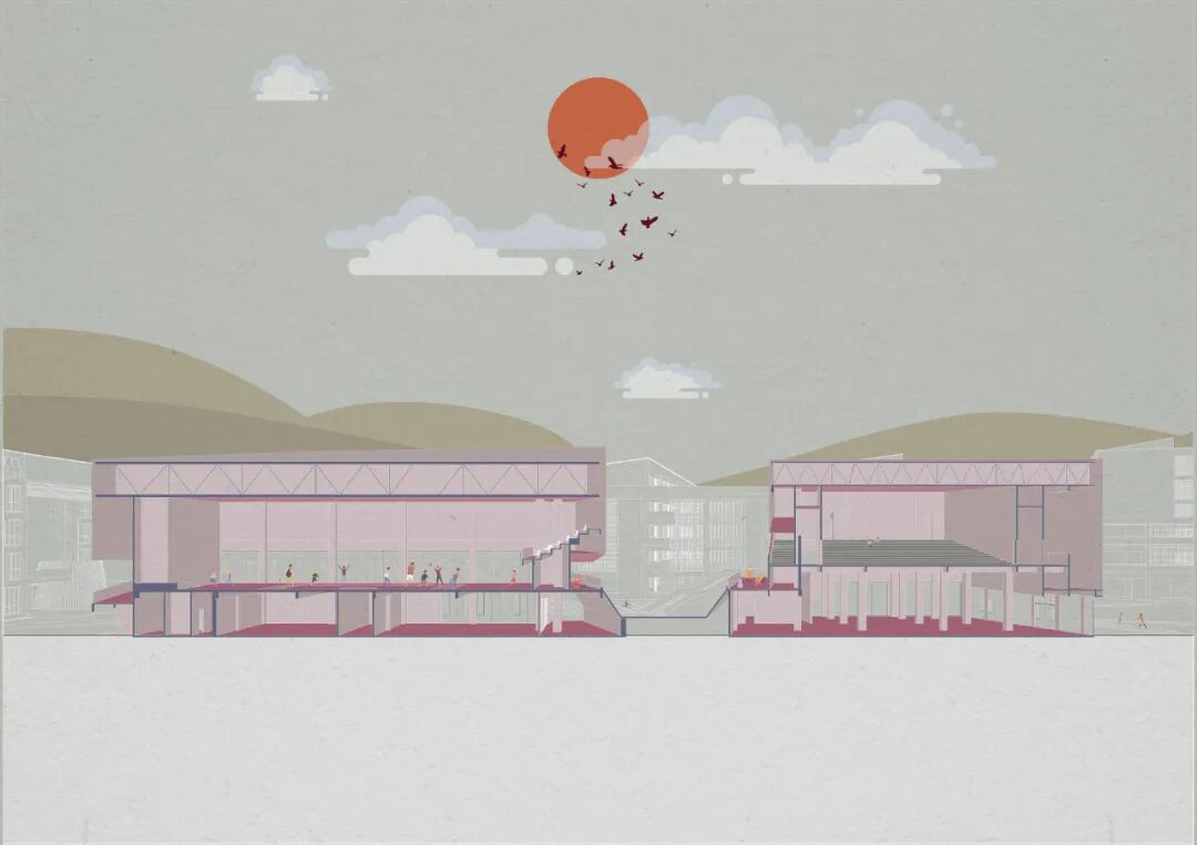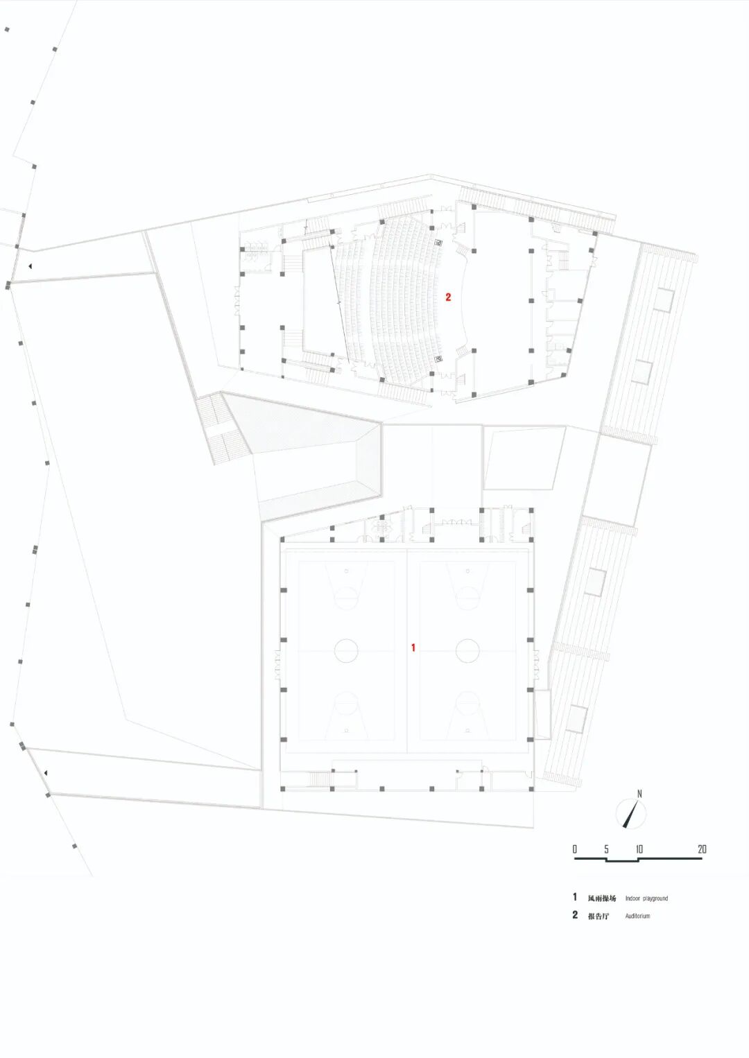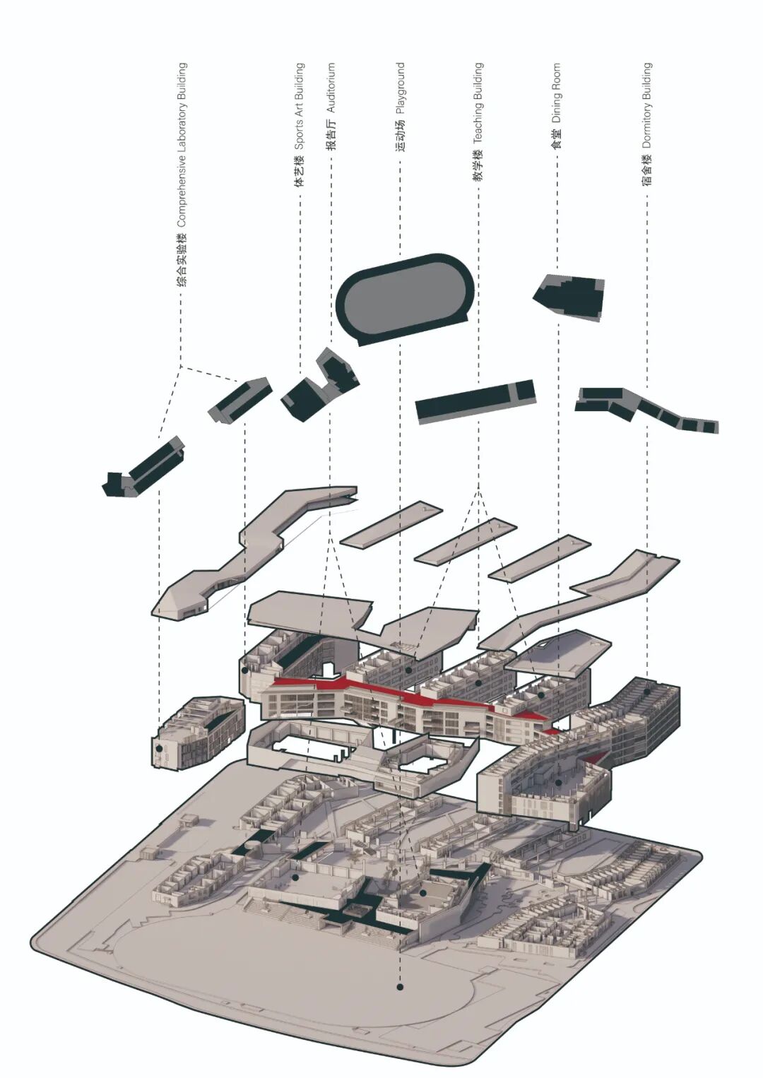 Part 04. Exploratory Three-Dimensional CampusAs Rousseau once wrote, "a man's curiosity is in proportion to his education." It is rare and commendable to grow up and still retain a sense of curiosity. The campus design intends to inspire students to explore. Zhongtai Middle School has a rich and three-dimensional campus space, with the Complex Building at the entrance presenting a window-shaped opening, symbolizing the open spirit of the school, while the building at the Culture and Sports Center breaks the dull spatial composition through large-scale cutting and deformation, making the building a scenery of the campus, and every step of walking through it gives you a different scene, just like walking through valleys.The entire Zhongtai Middle School is more like a "porous sponge", with sunlight and scenery penetrating in. In addition to the core space, the multi-platform shared spaces constitute the main energy field of the school, and the campus above the platforms is more three-dimensional, with a broad view of mountains afar. The shared spaces are not too aggregated to avoid becoming dull and uninteresting, but rather present a scattered and free distribution pattern, either protruding or obstructing, waiting for students to explore at any time.In the process of exploring, students will be connected to education through a comfortable link, instead of a forced connection, which is also where we started with this design and we look forward to discovering more possibilities in future use.