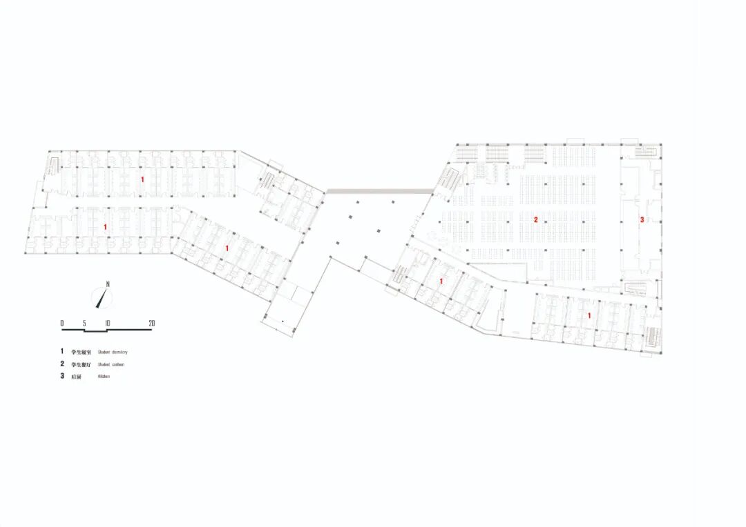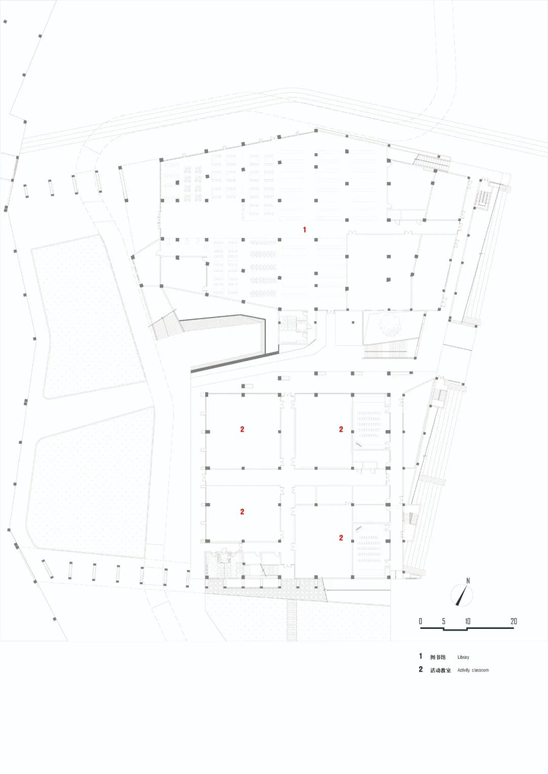 Part 02. Multiple Dynamic Lines ConnectedSouthern cities are wet and rainy, and humid in the summer. As the school needs a venue for students' extracurricular activities regardless of the weather, the space of a corridor become the best choice. We designed a 2km corridor, which is like a tree branch stretching in the air, connecting teaching, PE, office, landscape and other functions. Students can play, run, communicate and read in the corridors, making the originally "fuzzy" place a vivid and lively space.The core functional area is broken up and reorganized into a pan-core area, with the activity and art area on the east side and the living area connected to the teaching buildings from north to south. At the main entrance on the south side, there are the Complex Building and the Experimental Building, while inside the campus, rich, three-dimensional dynamic lines connect the various functions, releasing more "fuzzy" spaces as combined courtyards, corridors, grey spaces or sightseeing decks, to achieve efficient interconnections like an urban complex, while providing fun at the same time.The overall appearance of campus buildings exhibits certain changes and turning momentum. The corridor space is not only a transportation place, but also involved in the building appearance. The core buildings, i.e. the arts library and gymnasium of the Cultural and Sports Center, are not only connected through the outdoor corridor on the second floor, but also integrated into one building through the third floor corridor. The stairs and aisles are partially visible on the facade of the building, making them "windows" for dialog with nature.