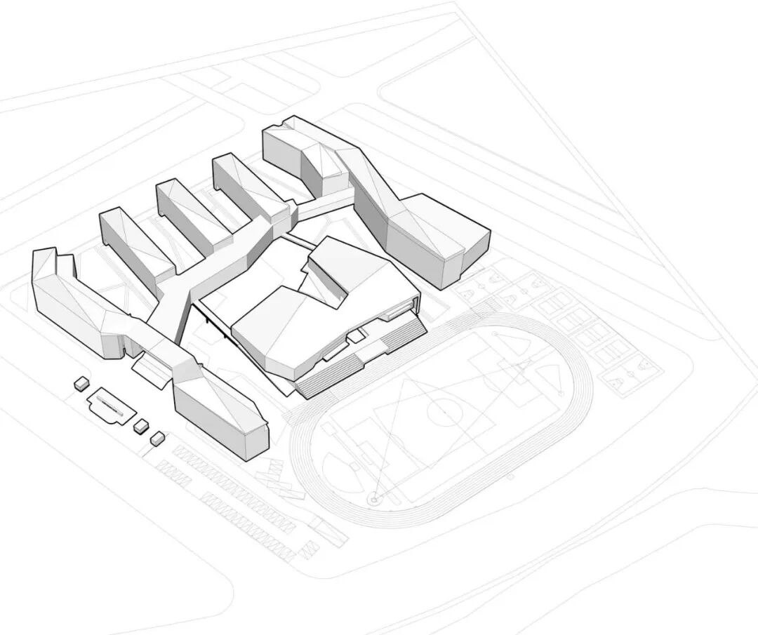 Part 01. Background of Campus DesignLocated in Zhongtai Street, Nanhu New City, Yuhang District, Hangzhou, the new site of Zhongtai Middle School is adjacent to the Future Science and Technology City in the south, next to the farmland in the northeast, facing the mountains and waters, with a high degree of urban accessibility. The plot is a rectangle which is relatively long from east to west and wide from north to south, with a total floor area of 80,000 ㎡. The design put the functions of teaching, sports and living into the campus from west to east, accommodating a total of 51 classes, as well as a 400m standard running track, and keeping the campus open to the city at the right time.The design echoes the urban texture, adopts a sparse and dense spatial pattern, and neutralizes the free and centralized planning methods to give full play to each of its strengths. The architecture and nature provide shelter for each other, with each function scattered and radiated to create a pan-core ecological green valley campus, which enables students to receive secondary education and acquire more knowledge, and at the same time, they can walk, run, and look into the distance freely, and stroll freely in the scale of the intimate, ecologically pleasing campus, as if they were accompanied by the mountains and forests.