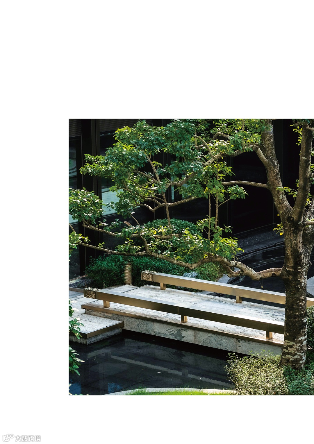 借助现代镜面水景工艺标准及薄池壁等专利技术,确保玉山园的水景建设落地;镶嵌着黑山石原石的绿岛色调凝重高雅,搭配铁冬青的枝干曲折苍劲,蕴含诗意,成为“一池三山”空间中的画龙点睛之笔,镇景之魂。