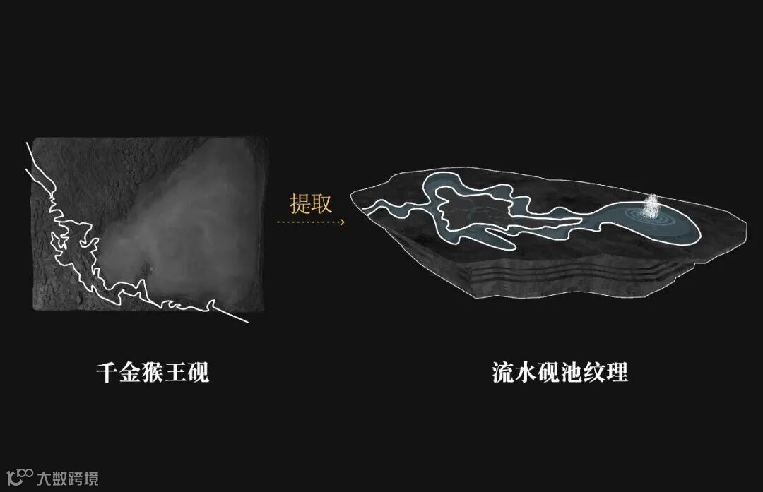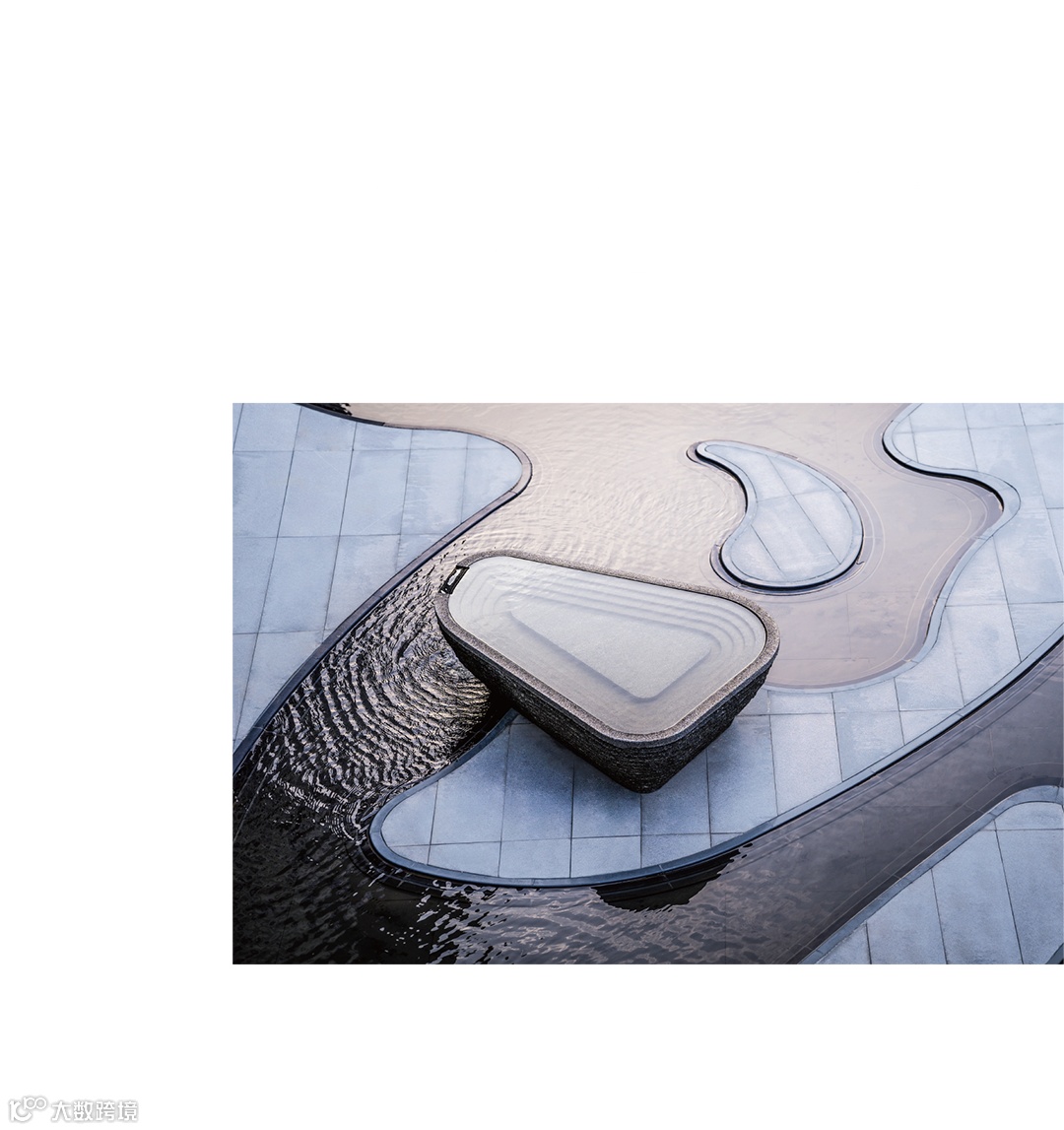 水池周边以模块化切割打造自由灵动的池岸,配合纹理也似水流的痕迹的自然纹黑色流水石铺装,增加流水的动感与美感。