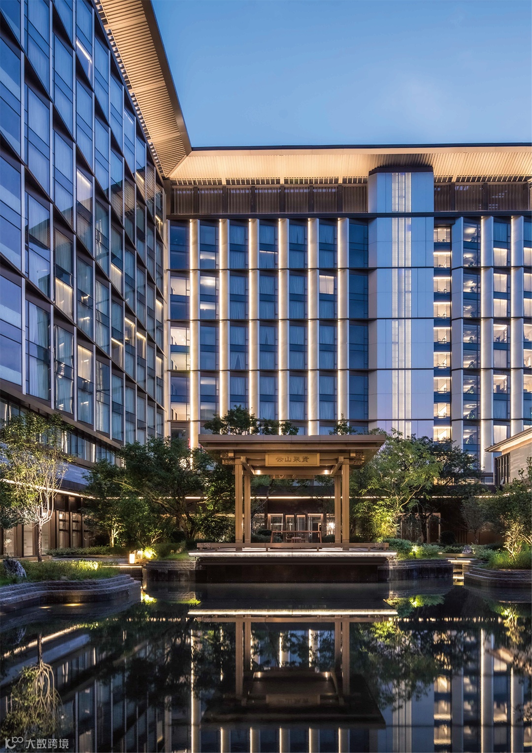 酒店群整体采用行列式布局的新中式造型,体现岭南建筑和园林特色,并融合东西方设计手法,打造了与自然风光和谐共融的城市新地标。