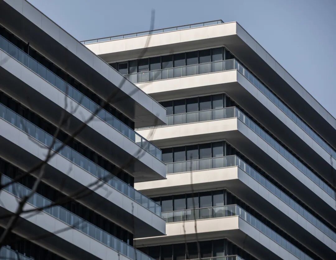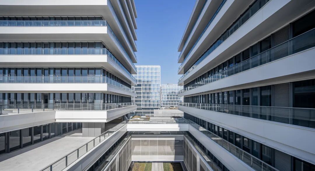为了使在这里办公的人群增多体验性,设计让南侧的大体量建筑保持与城市界面平行,在园区内侧的建筑则打破兵营状的布局模式,每个单体结合中央庭院和周边景观进行一定的偏转,一来在办公的人群站在园区里感受私享景观的同时,也能观赏到建筑的灵动与多面性;二来各楼栋露台相对处可以产生更加宽松舒适的间距。