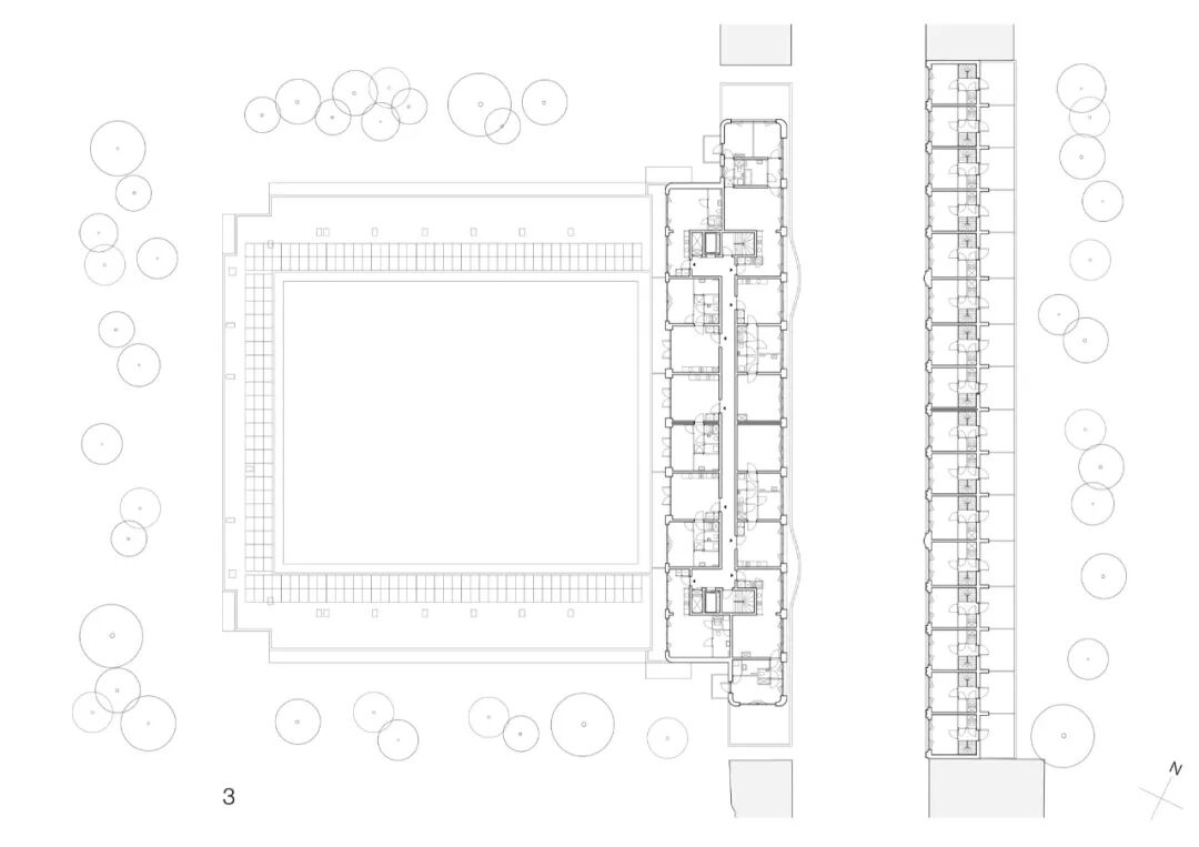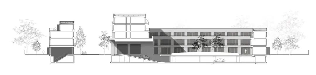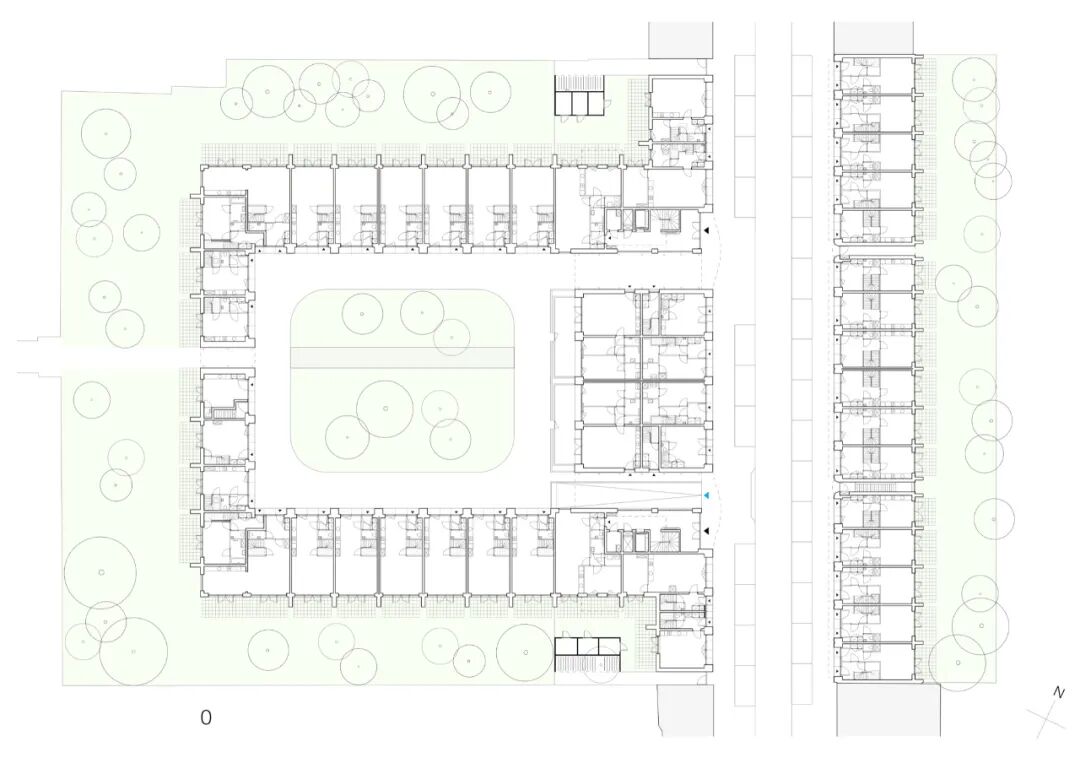 In the large block, houses and apartments have been designed in different categories and typologies: including social rental housing for starters, seniors and larger families, rental apartments for the private rental sector, and owner-occupied homes in a communal courtyard. The apartment entrances are located at two gates, which provide access to both the houses and the courtyard. The ramp to the underground parking garage is also located at the southern gate.