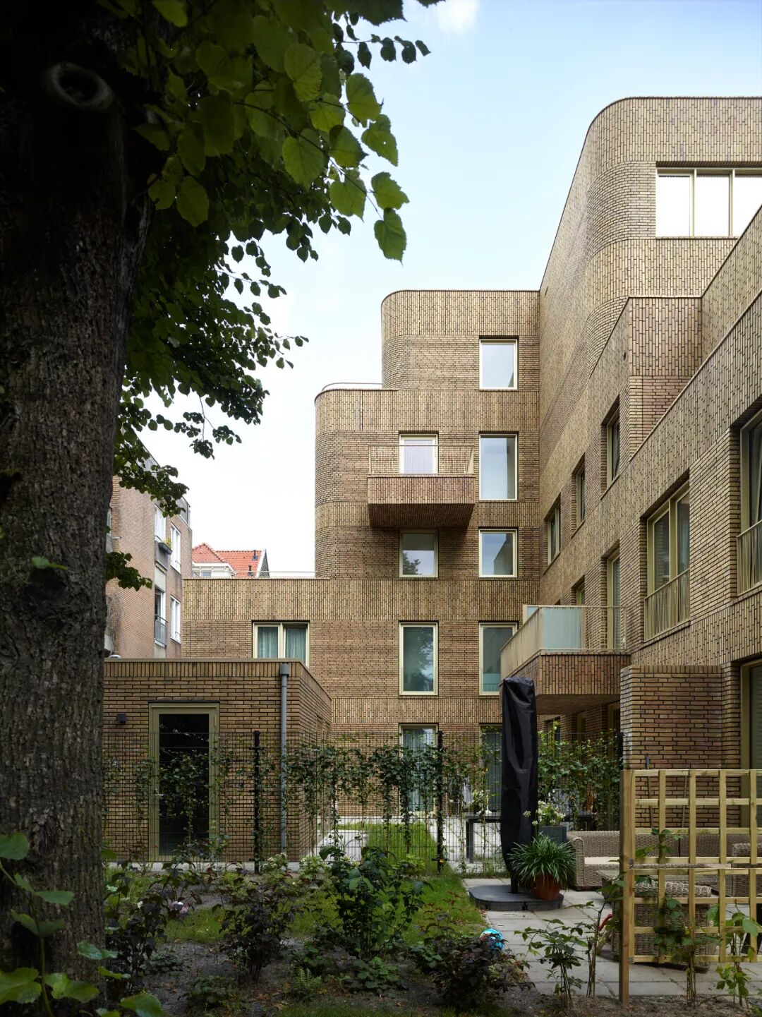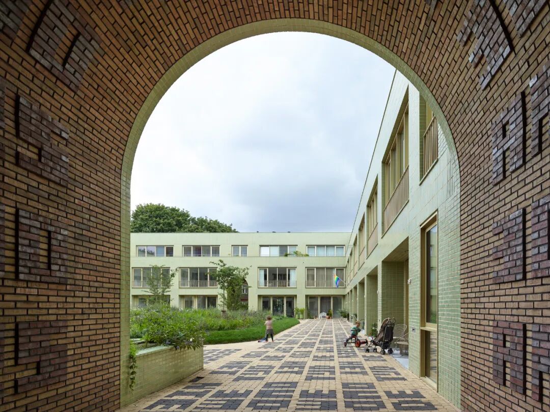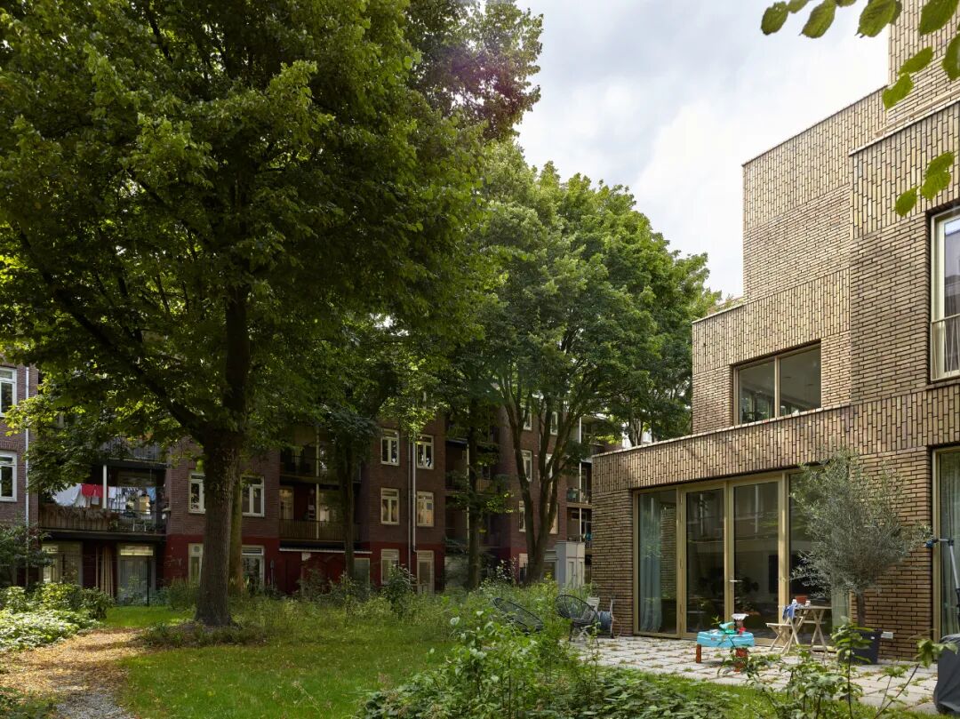 The balconies above the gates protrude so they clearly mark the entrances from the street. In the gates, the art of Martijn Sandberg depicts the 'connections in time' with the neighborhood. Two social spaces and a communal area for residents provide space for neighborhood functions and underline the concept of ‘collectivity’. A 'green cushion' has been laid out in the courtyard following a design by DS Landscape Architects. A collective garden is placed between the existing buildings and the new construction, which is also accessible to the surrounding houses.