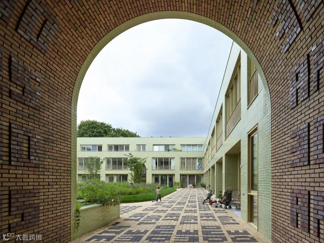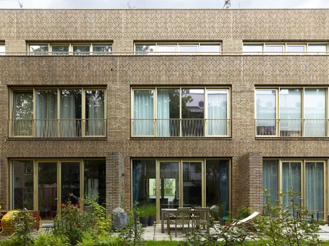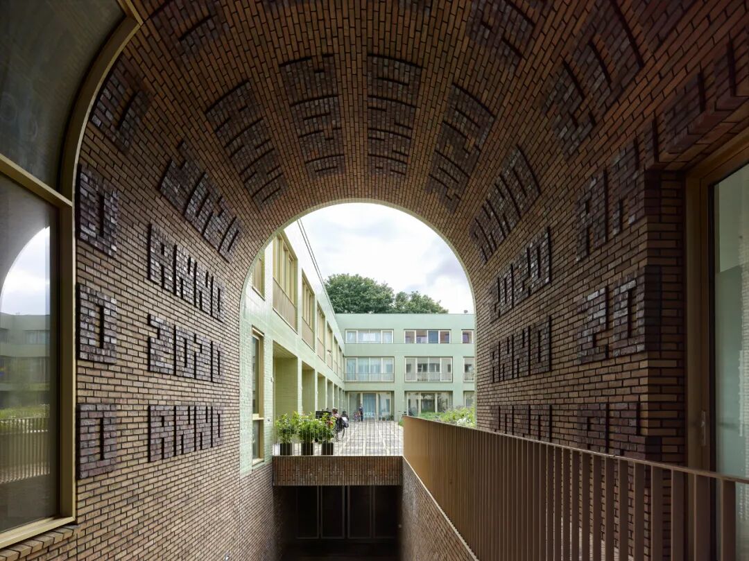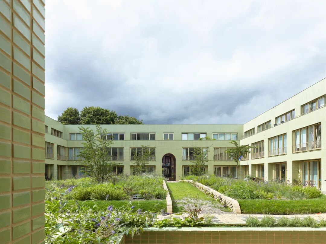 The balconies above the gates protrude so they clearly mark the entrances from the street. In the gates, the art of Martijn Sandberg depicts the 'connections in time' with the neighborhood. Two social spaces and a communal area for residents provide space for neighborhood functions and underline the concept of ‘collectivity’. A 'green cushion' has been laid out in the courtyard following a design by DS Landscape Architects. A collective garden is placed between the existing buildings and the new construction, which is also accessible to the surrounding houses.
