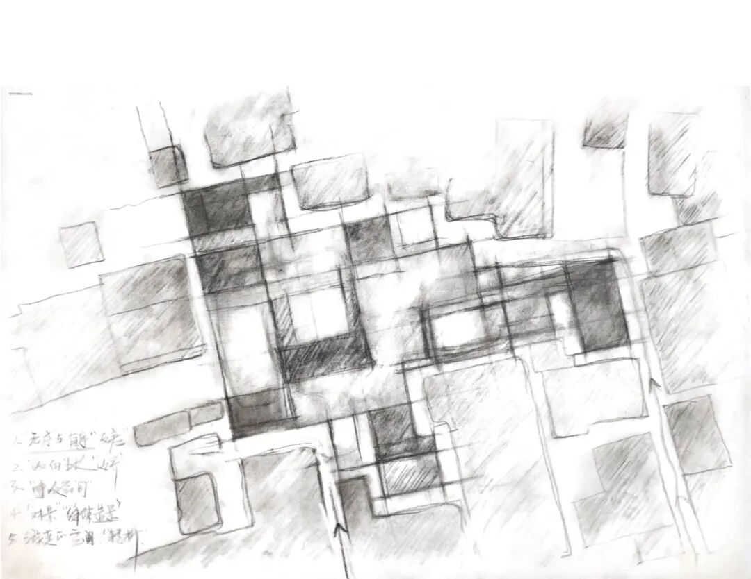 开始确实也造成了一定的困扰,总觉得在这样一个很紧凑的场地里塞进去一个建筑体块,感觉没有“景”也没有“空间”,利用率也不高。在反复思考后“既然要做一个内向型的空间,何不引入一些中国园林的思维?完全隔绝于外部环境,制造一个内部世界,在充满复杂性的围合中制造一个极度纯粹、纯净及静谧的内部空间。”