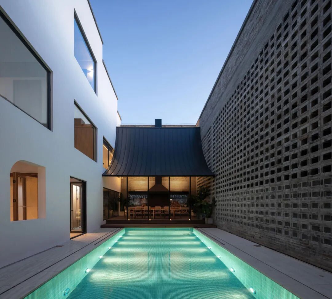 所以我们有违常规的将公共客厅与接待区放置在建筑的中心位置,从中心再往四周辐射。从入口开始进入到前庭院,再转换到玄关处将视线定格在玄关处的墙上,再转经过泳池、楼梯及内庭院最终到达接待公区。我们希望当人们在进入到这个建筑的时候就开始整理思绪和调整心理,虽然这是一段短短的行走路径,但当他行走在这种“不确定性空间”的时候可以让他感到新奇,激发他对这个空间的探索和好奇心。