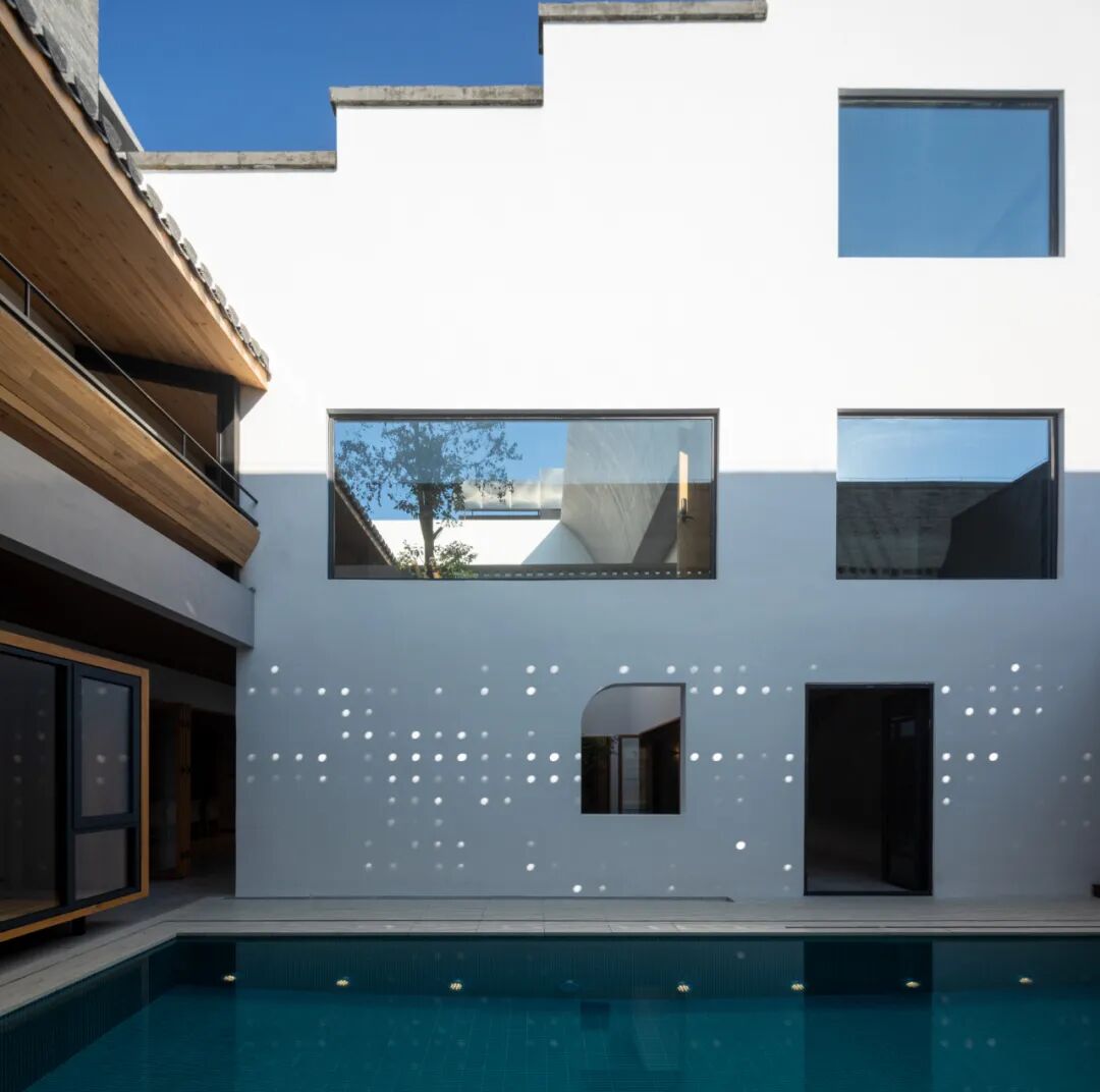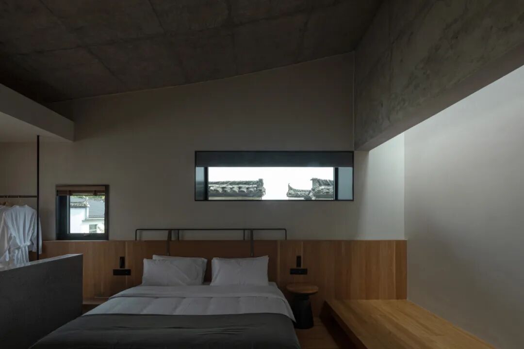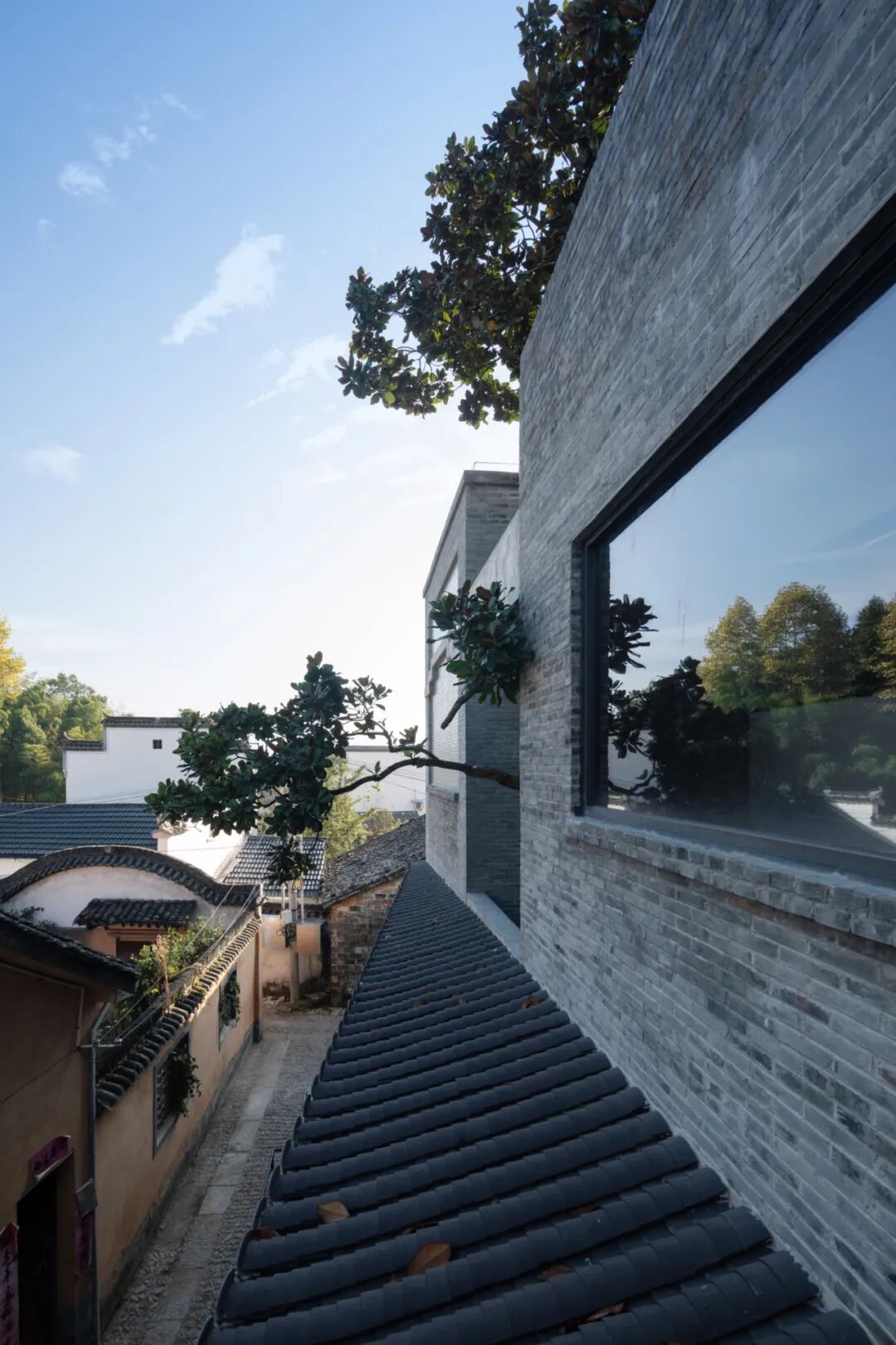 临周边民居的建筑的墙与院落几乎不作任何的开窗,通过内部庭院和天井去制造视角与景观,在内部间隙中去与自然互动。在一些不得不开窗但又与邻居离的很近的空间,为了保留一定的隐私性与舒适性,我们采用视觉错位的方式去进行规避。如突破常规高度视角的高窗或极低的低窗,让它既可以保证光线和通风又能避免视觉上的直视。同时还尽量将窗创造成一个取景框,将外面斑驳的古砖墙框成一副画,将绿郁葱葱充满生机的植物内庭塑造成一个橱窗,抑或是框住远处的碧山。