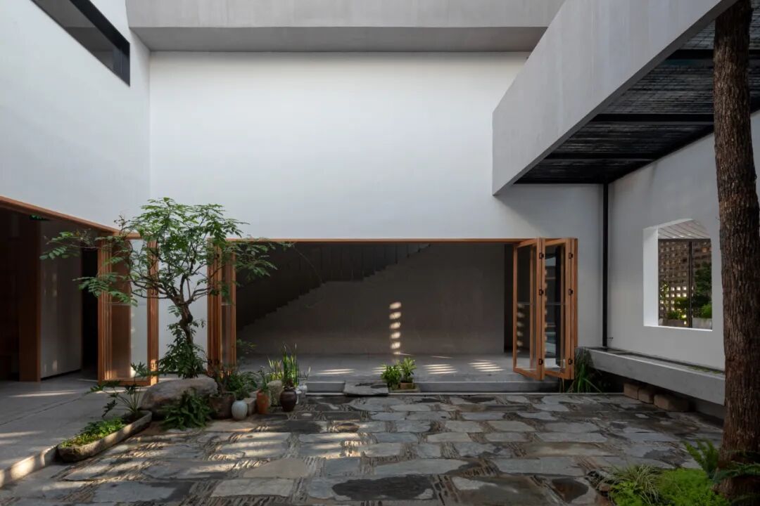 场地的设计策略并未作大的调整。在将各个功能填满后,我们保留了场地中已有百年的大树与古井,再将庭院、天井植入各个建筑体块中,在各个体块间隙中嵌入或大或小的内庭院进行虚实之间的转换与过渡,并形成视觉重心。在制造丰富的内部视觉意像的同时,也通过内庭院及天井,让建筑内外之间、自然之间形成一个过渡与连接。