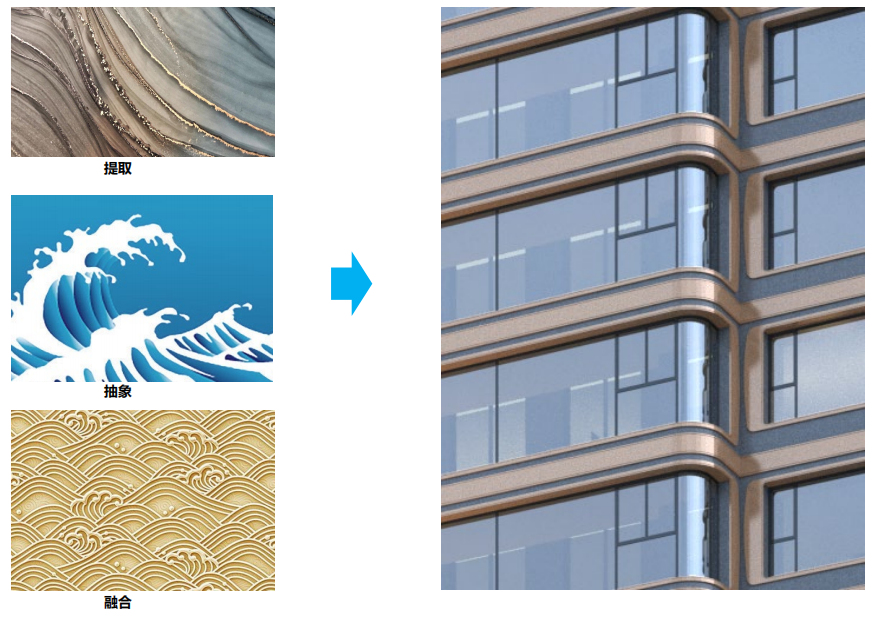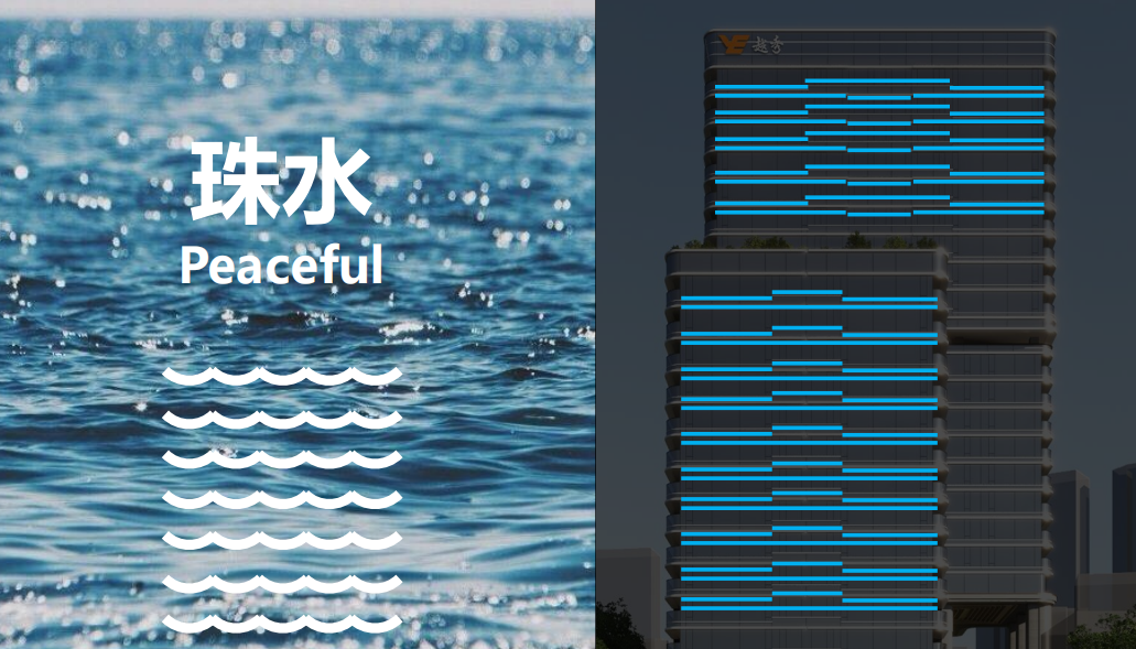 建筑立面取“珠水”之意进行艺术和立面的重塑,以横向线条延续沿江建筑立面的延展感,360°环幕立面,“让建筑像江水一样流动起来”。