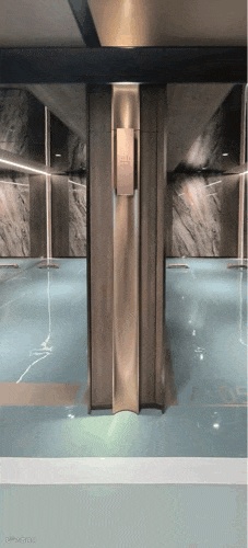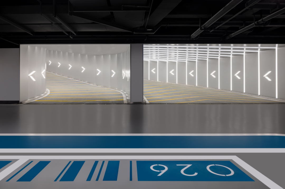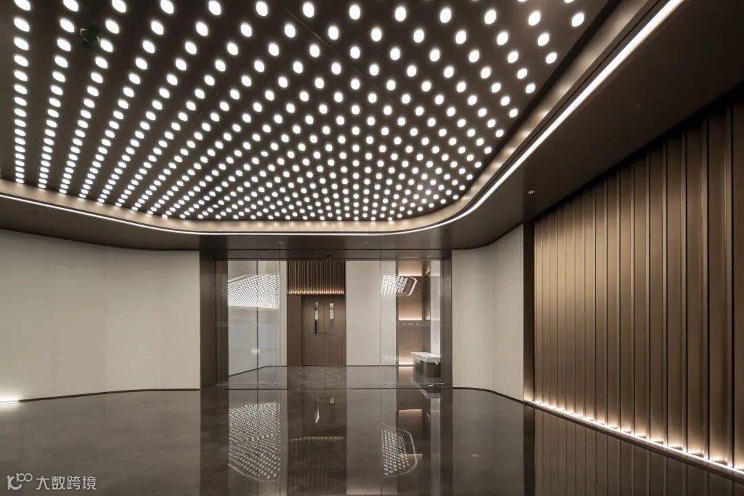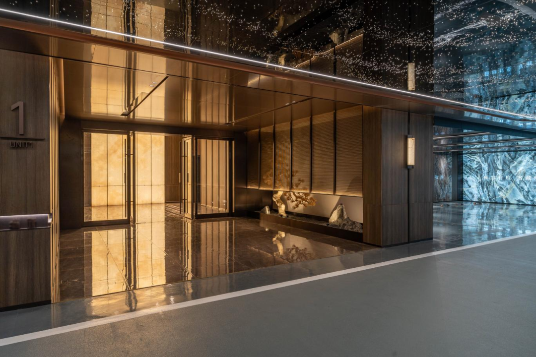 全铝板吊顶、3万颗灯源的星云光纤艺术吊顶、在车库吊顶位置还装饰了黑色镜面不锈钢;木纹饰面结合弧面不锈钢壁灯的柱网,且配置“消隐”消防栓;大面积仿玉石岩板车库背景墙;光面环氧地坪、车道是橘皮环氧地坪、香槟色车挡和地面划线……;与车库无缝衔接的艺术地下过厅;通高、低调奢华的地下大堂和候梯厅……
