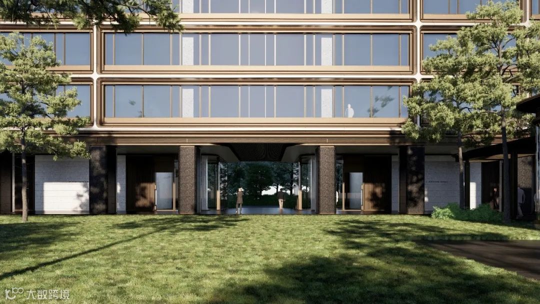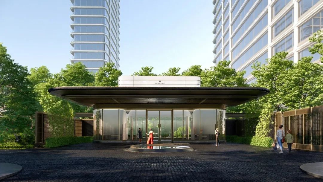 立面设计延续天珺系列血统具有辨识度的公建化外立面风格,石材/仿石砖、金属和大面玻璃,形成昭示性性超强的建筑。