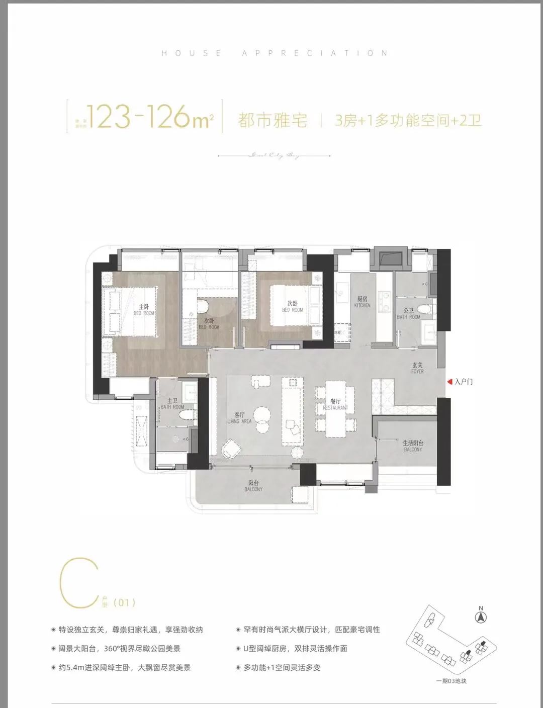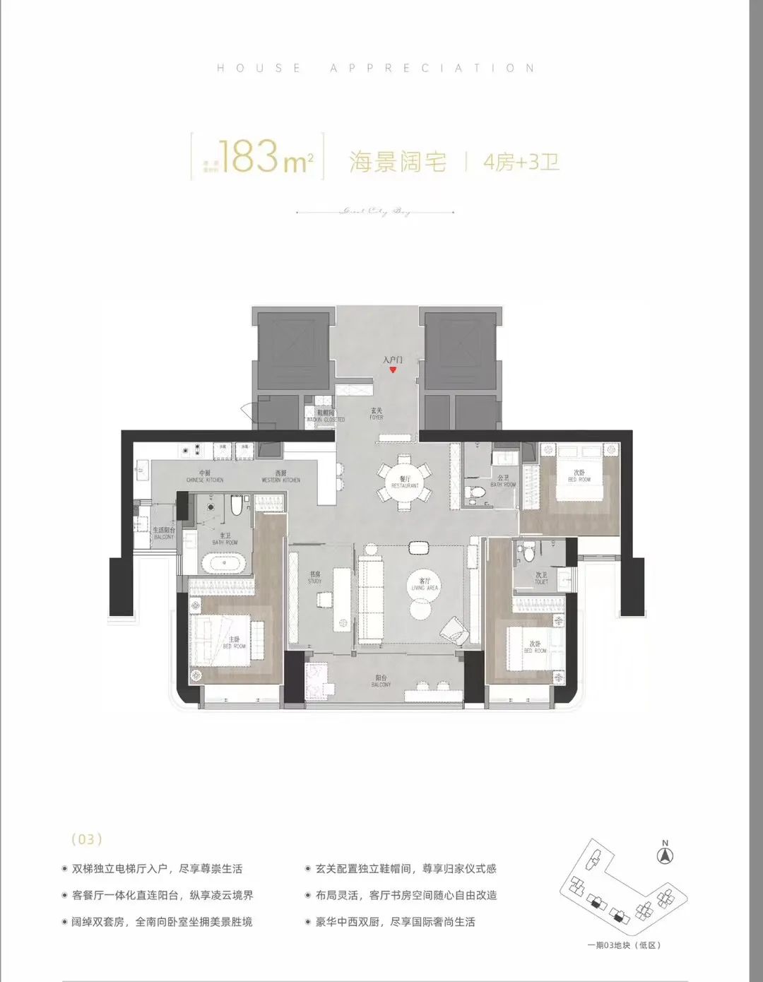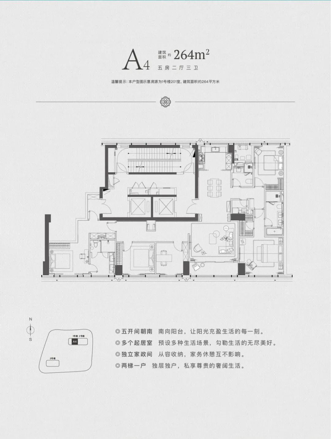 主推建面约128-238㎡的改善大平层,全系配置独梯入户、私享电梯厅,仪式玄关、LDK厨房,阔尺方厅、酒店式主卧套房、精细化收纳系统。