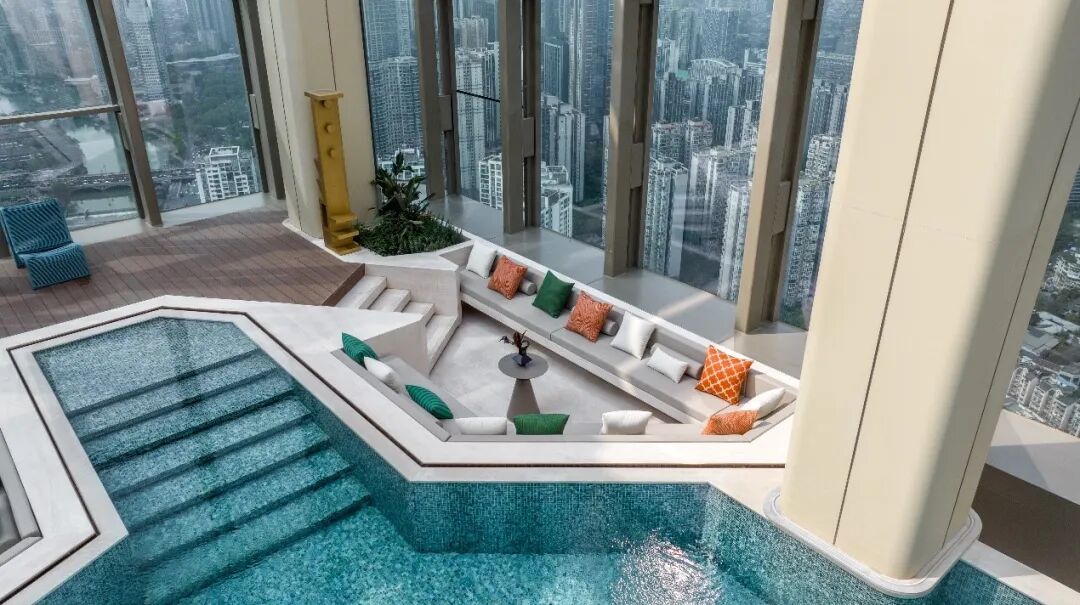 全手工拼接的红铜拱形电梯厅,复刻伦敦蒙德里安酒店风格的咖啡厅,大量金和青金石结合的吧台,三角钻石切割穹顶的艺术馆,避难层“盗梦空间”式空中健身绿洲,充满时尚感的超跑级环氧地坪漆车库,拥有无边露天泳池、半户外社交露天酒吧和法国设计师杜马斯泡泡屋的J222天际会所……每一面,都是成都·嘉佰道的360°无死角的审美。