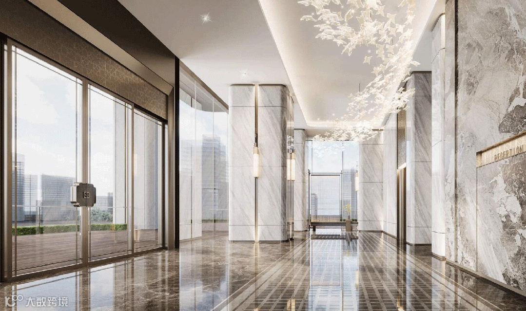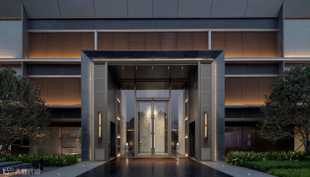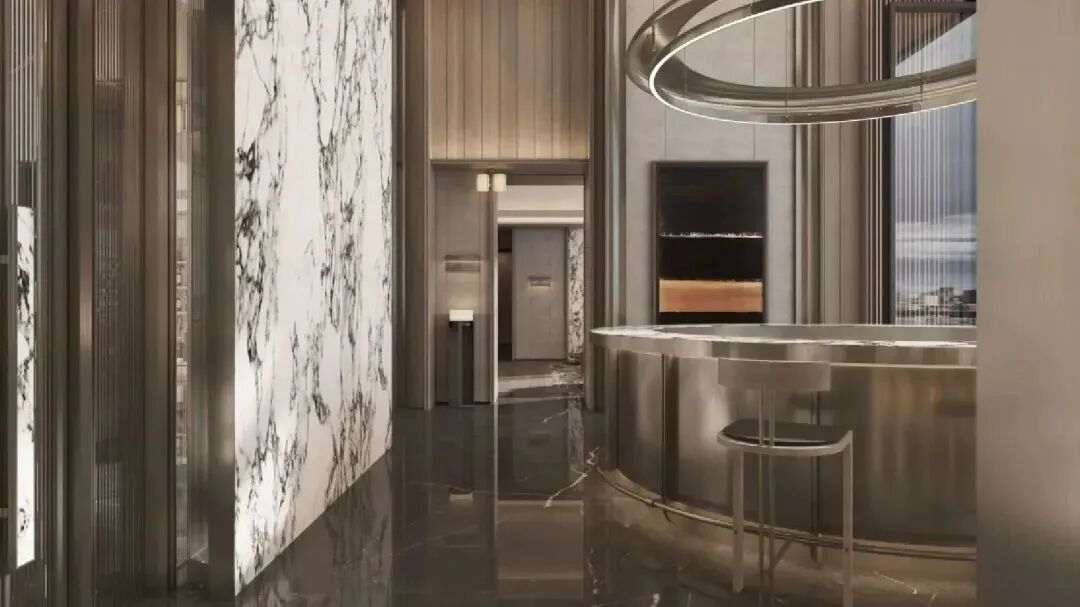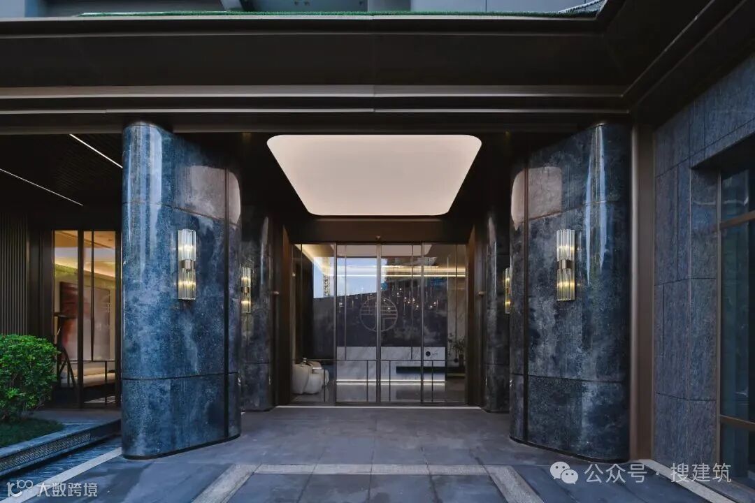 建筑语言结合华润置地悦府VI元素,在墙面纹样乃至楼栋大堂开门执手上加以运用,烙下悦系高定精工的印记。楼栋入口尊享仪式感,约5.4-7米通高门楼、5.1m高电动平衡门,营造超尺度体验,蓝珍珠石材搭配香槟金铝板,尽显世界摩登格调。