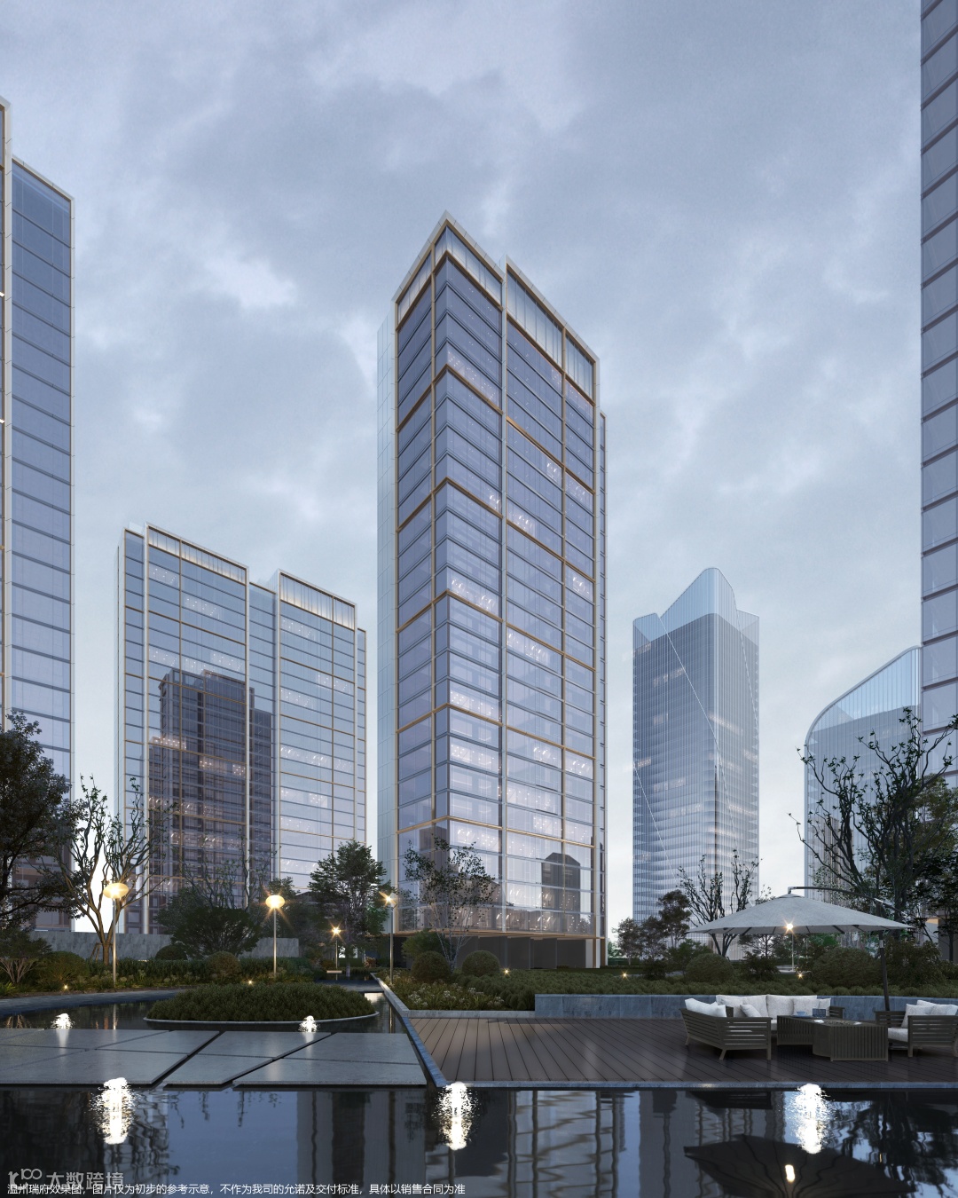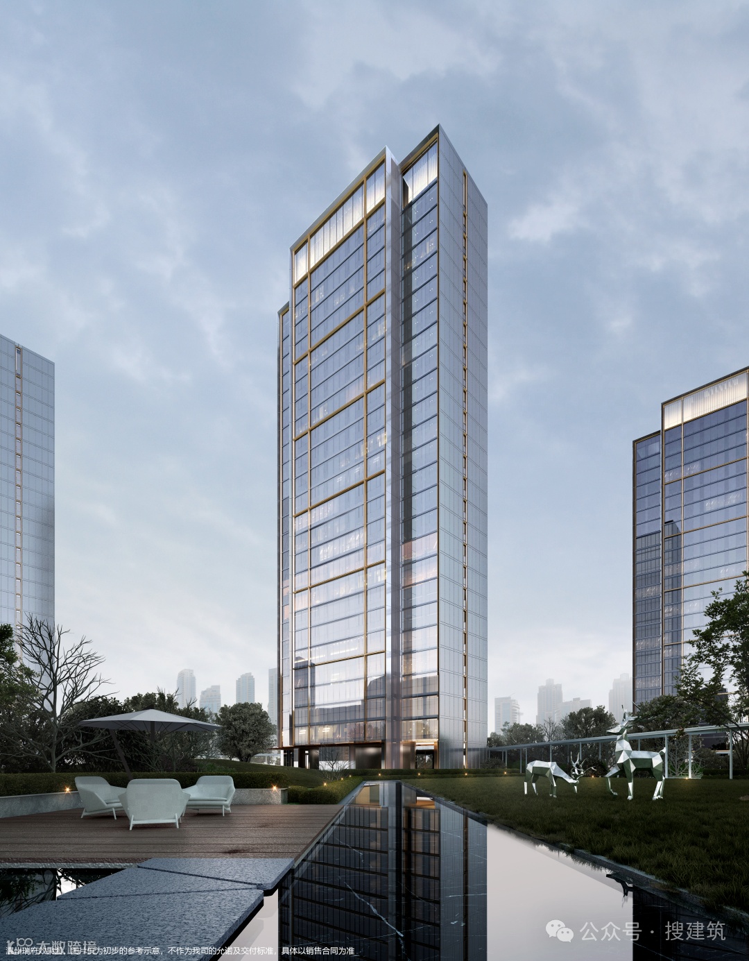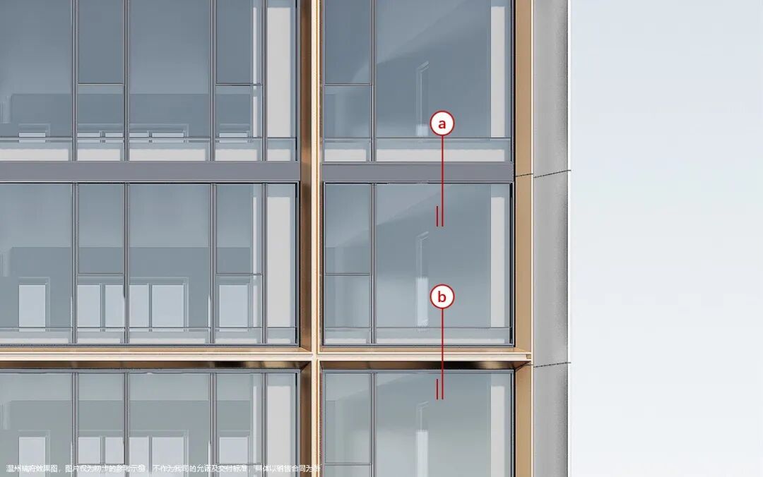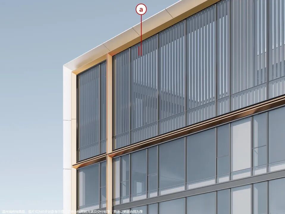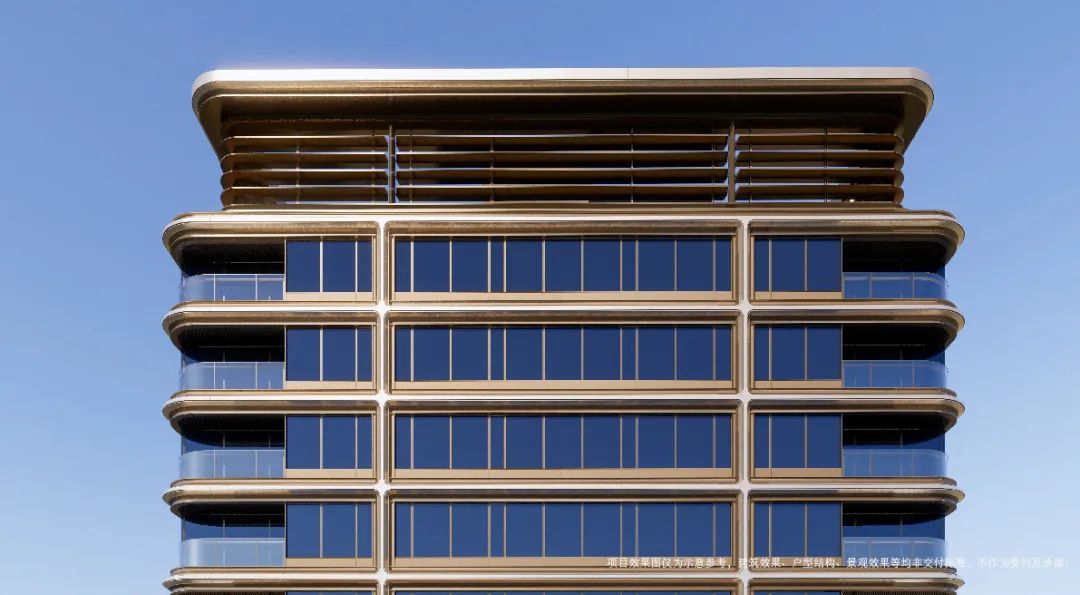 全封闭的阳台设计、香槟色的金属线条镶嵌、双层钻石斜切金属框的设计手法,让立面更为挺拔、精工奢美。顶部的造型,通过玻璃内衬格栅的方式,结合高低错落的标志形体,如瓯江上的灯塔。