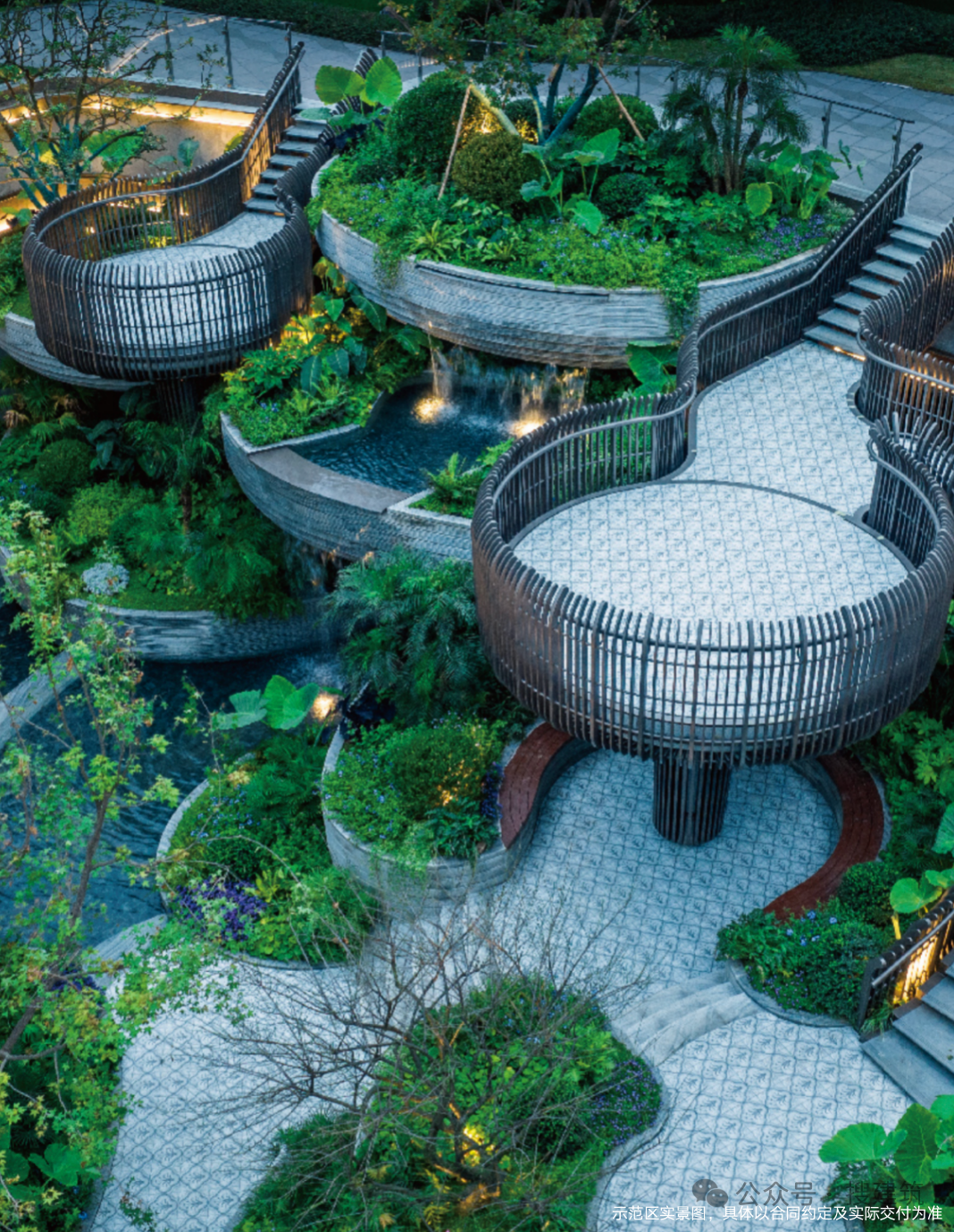 与其他下沉庭院不同的是,天琴华樟打造了纵向空间的立体式园林景观,7大主题园境,8大沉浸式场景,约6米高差的下沉式庭院,八层平台叠加,呈现出有层次感、错落感和立体感的丰富景观体系。
