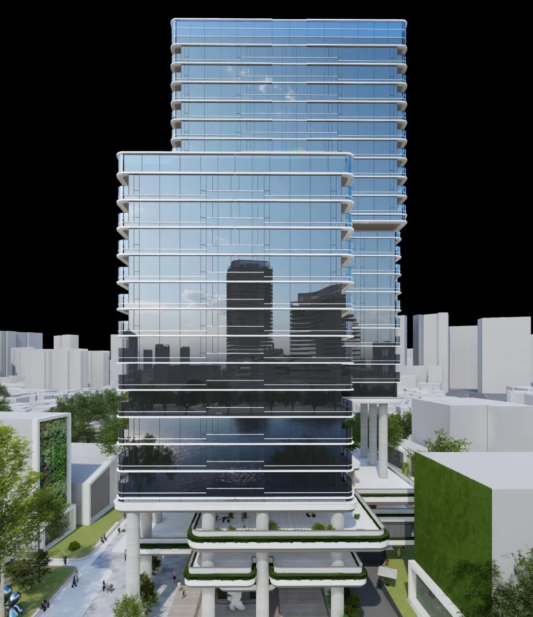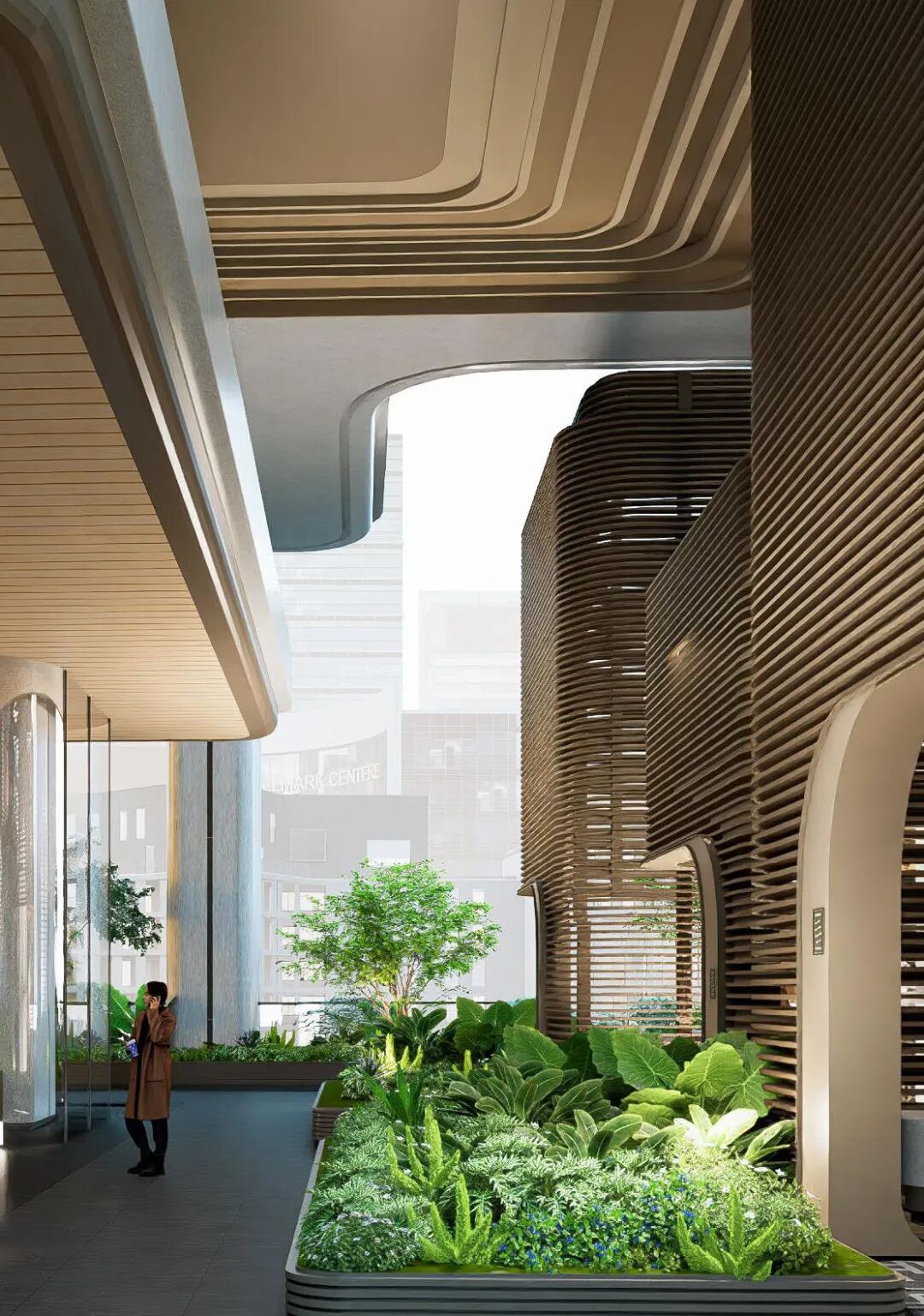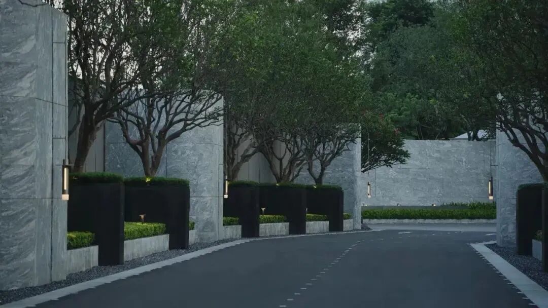 有别于传统高端住区的封闭感,绿城为了让社区温柔地投入城市的怀抱,从城市界面与总体规划开始,让所有楼栋与城市形成边界共构的关系,并通过空间的退让,在主入口沿街界面以自带网红气质的架空伞状空间、连续的玻璃盒子及穿插渗透的景观空间,为城市和行人提供一个遮风避雨、安静平和的居停空间,也塑造出一道现代靓丽的都市风景线。