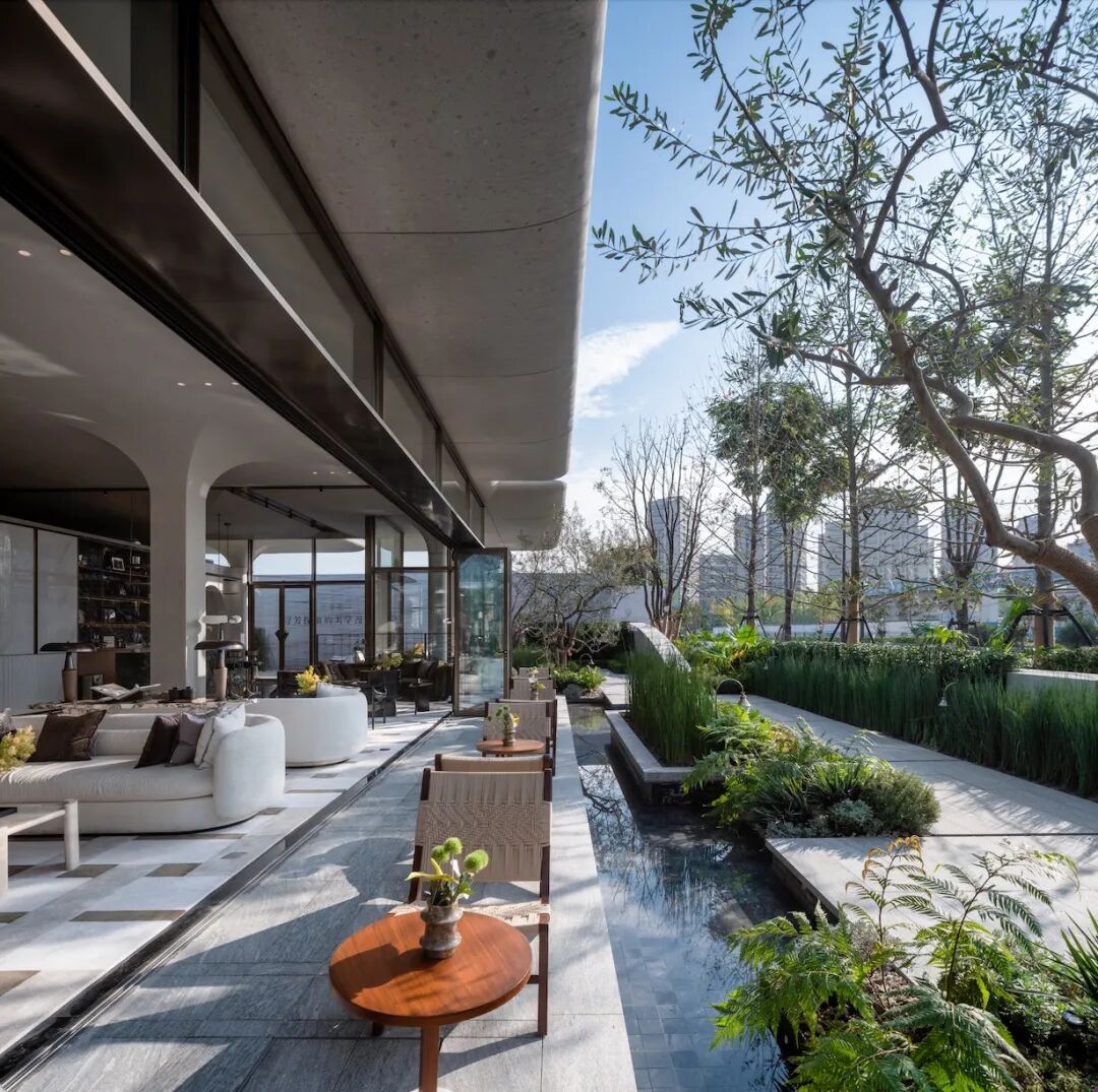 设计结合景观,打造出诸多层次分明、开敞,与自然连接、被自然环抱的静谧空间,营造“结庐在人境,而无车马喧”的空间氛围。