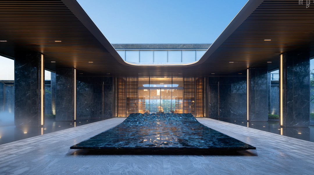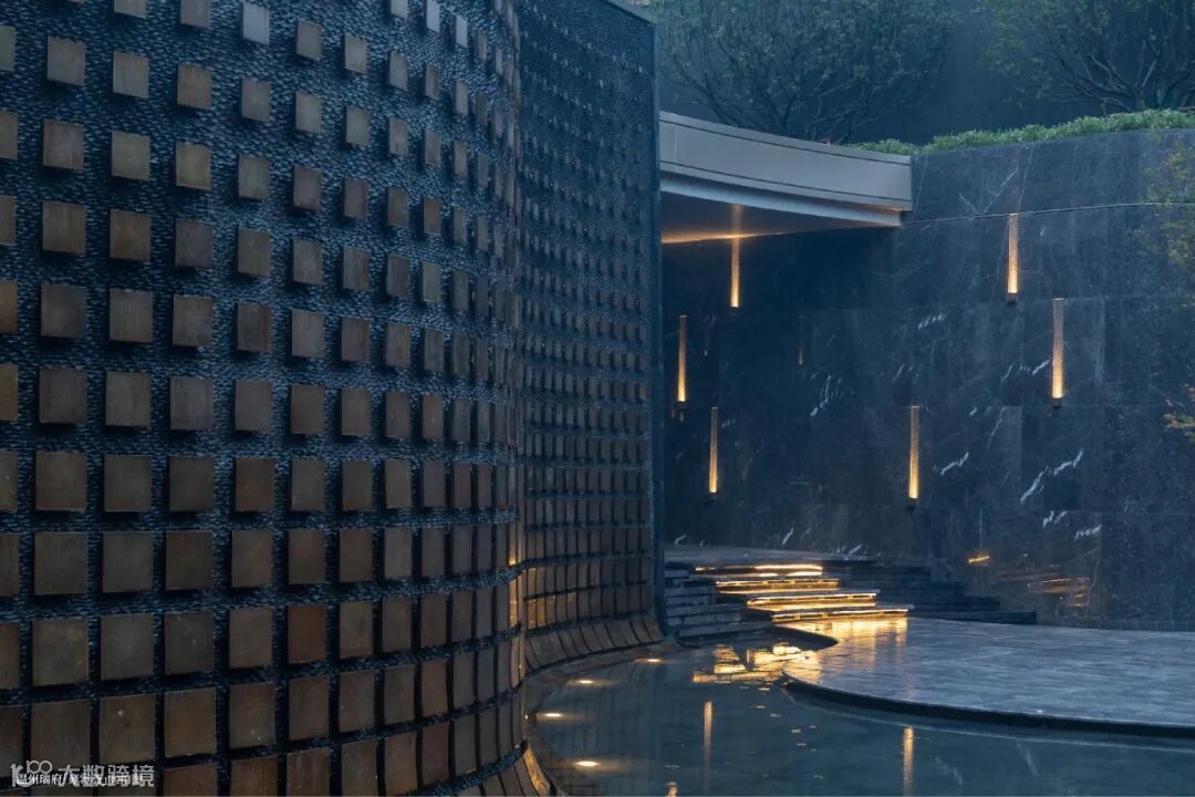 约1000㎡下沉水庭院作为核心水景之一,搭配约6m高双曲面跌水飞瀑,镶嵌1088块铜片,诠释瑞府臻于细节的质感。