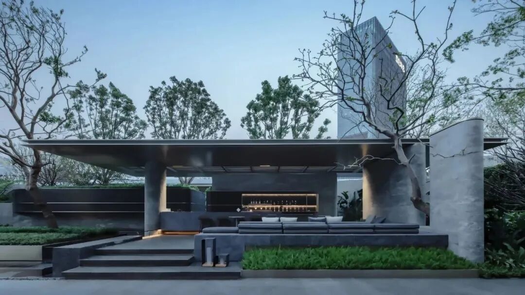 景观设计打造“一园三进五场景”,多进院落式庭院的宅居空间——酒店落客区、西关水庭、风雨连廊、中央庭院、社区典藏会客厅,转译岭南园林语言,以条石景墙,漏景叠水等现代手法演绎传统岭南园林的庭院造景,打造远离喧嚣的静谧庭院归家系统。