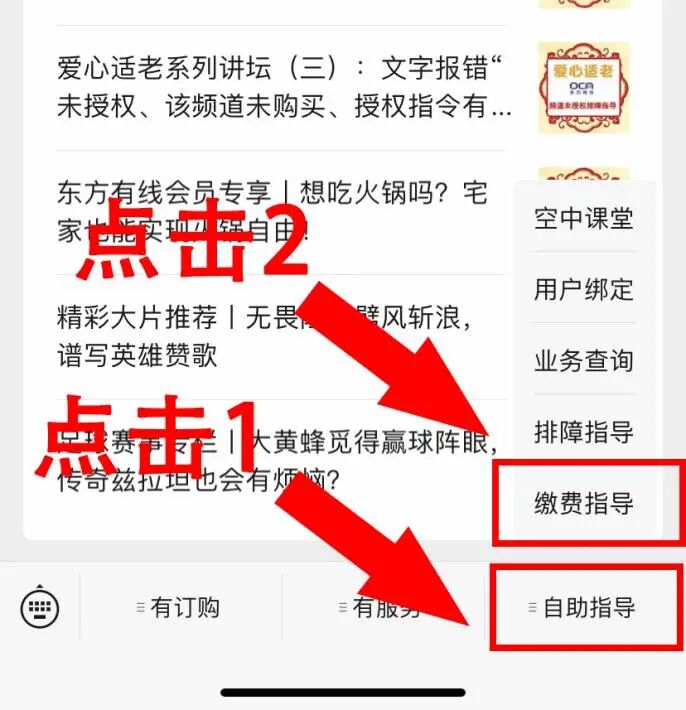 进入东方有线官方微信号,点击【自助指导】-【缴费指导】