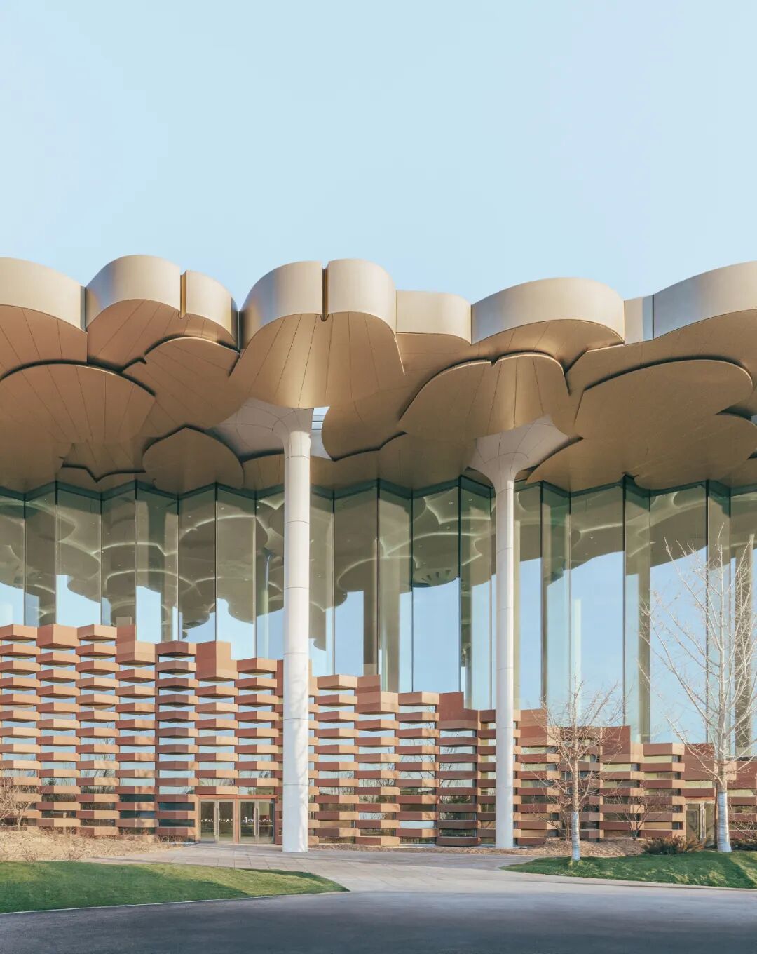 The project strives to address climate challenges by incorporating technologies to minimize the building’s embodied and operational carbon footprint. It employs modular components with a rationalized structural grid to reduce manufacturing waste. A single module is used for the ginkgo tree columns, which are rotated to create the appearance of variety. The columns are also fitted with climate control technologies, including lighting, acoustics control, and rainwater collection. The glazed openings are adjusted per the sun exposure, while the roof has integrated photovoltaic elements to ensure renewable energy production.