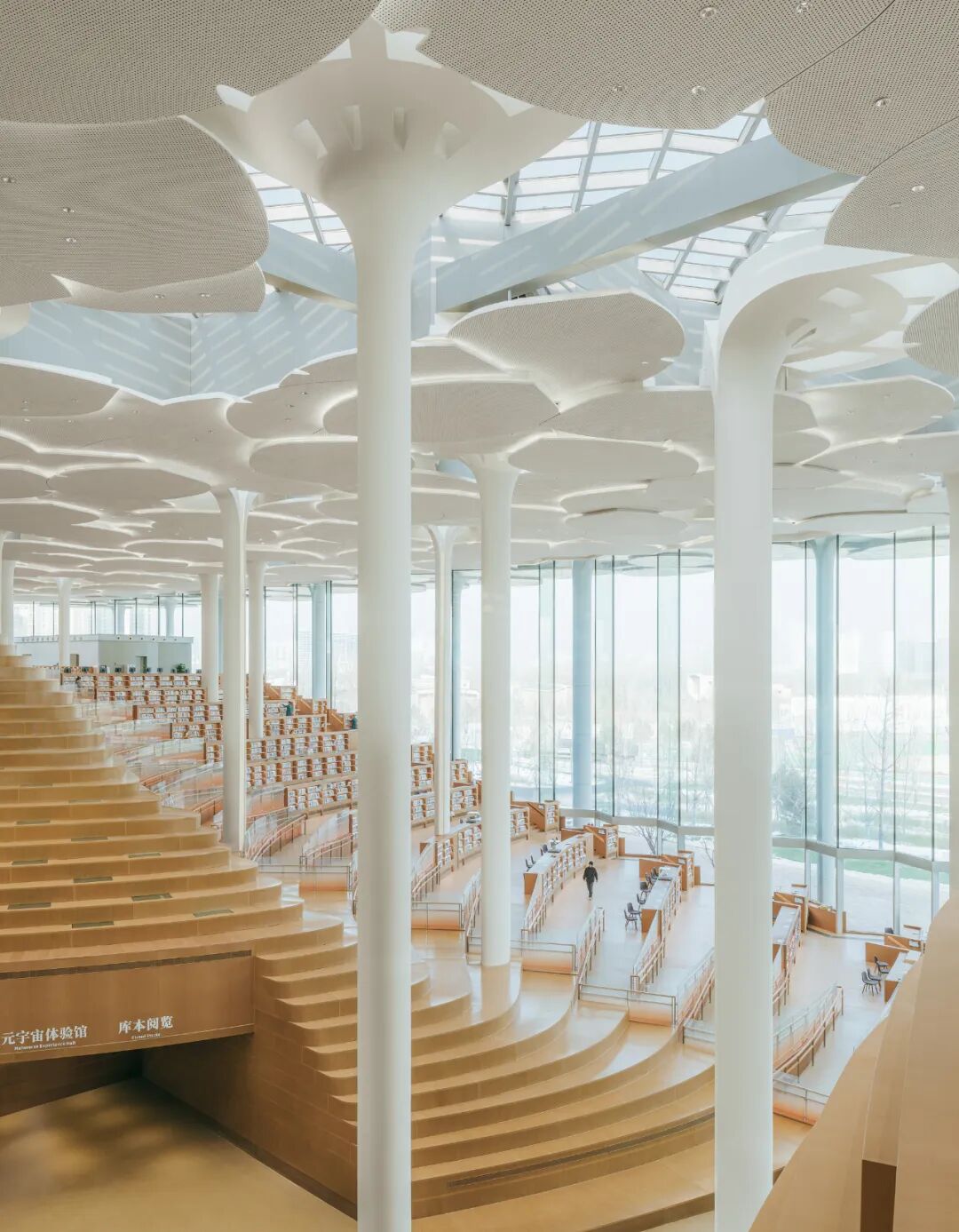 The Beijing City Library blends the natural landscape with the architecture. At its center, a 16-meter-tall forum welcomes visitors and serves as the main circulation artery within the building. Surrounded by curved stepped terraces, the forum mirrors the landscape of the nearby Tonghui River. The terraces serve as an informal zone for relaxing, talking, or reading while staying connected to the larger space. Smaller semi-private reading areas are embedded into the ‘hills.’This interior landscape sits under a canopy-like roof inspired by the ginkgo trees, bringing in daylight through the small openings between the petals. Real ginkgo trees at the entrances further enhance the natural ambiance, celebrating Beijing's heritage through the integration of reading, performance, and landscape.