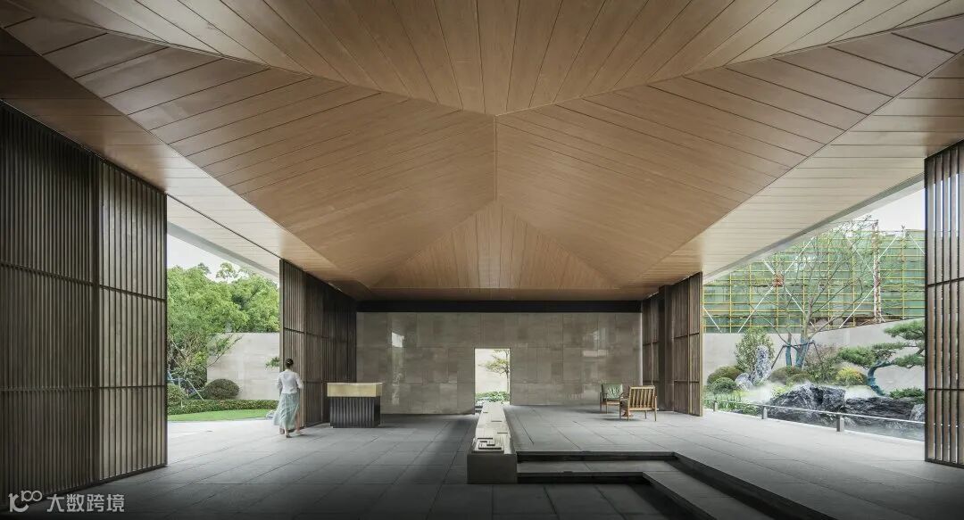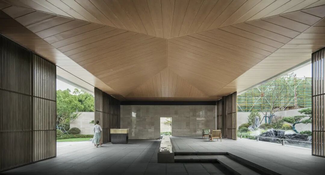 凯撒灰石材墙面和深色金属瓦屋面筑定了整体沉着大气的基调,进一步用木纹金属吊顶、金属格栅和栏杆勾勒工艺细节。造园叠山则选用了黑山石,与整体氛围更为融合。