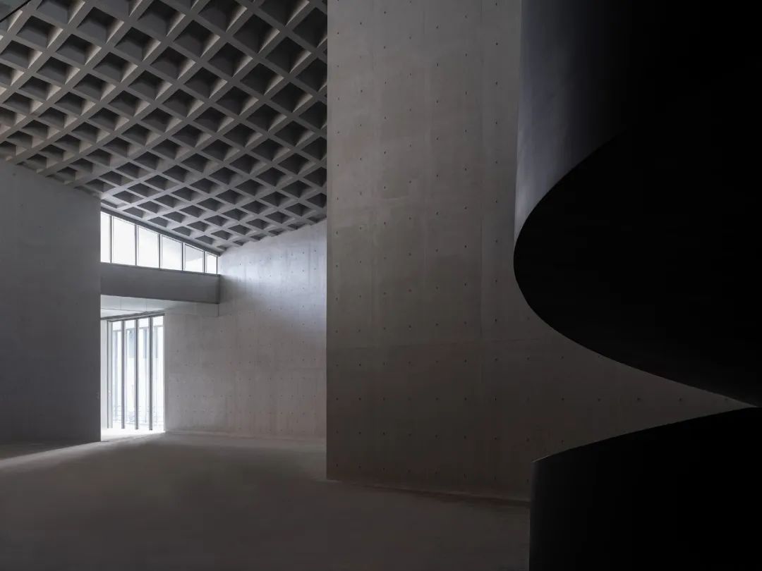 琴台美术馆柱室内屋顶采用了与井格对应的、顺应了曲面的参数化金属延展网吊顶。透过半透明的吊顶还是能看到屋顶的结构,也遮蔽着其中的机电管线。