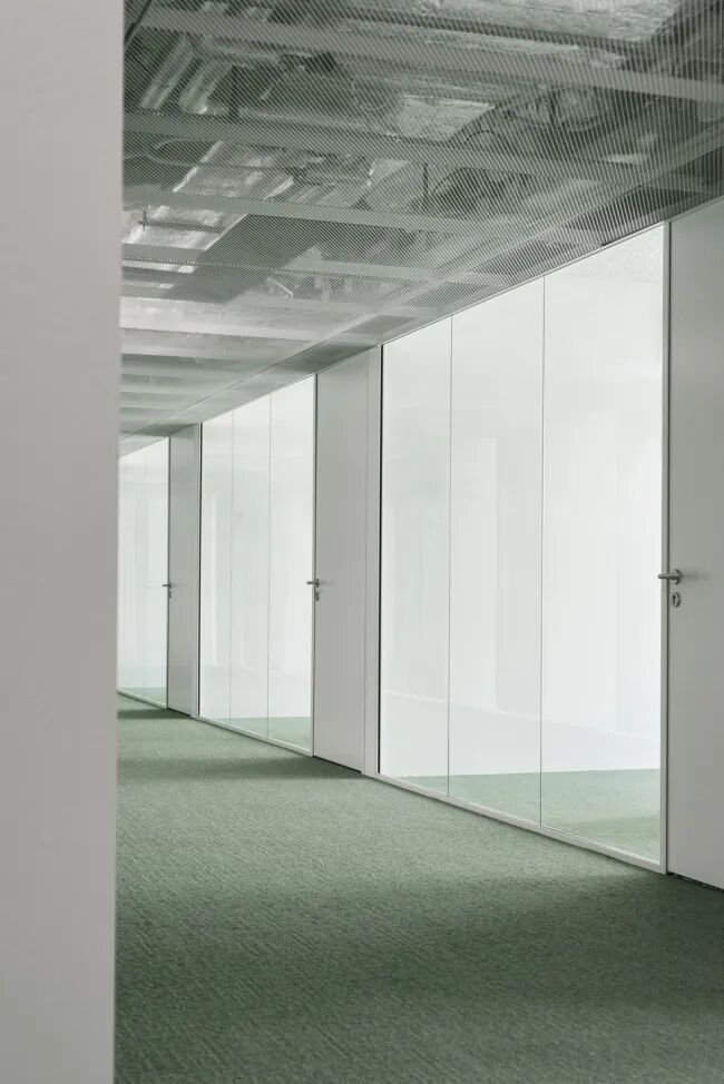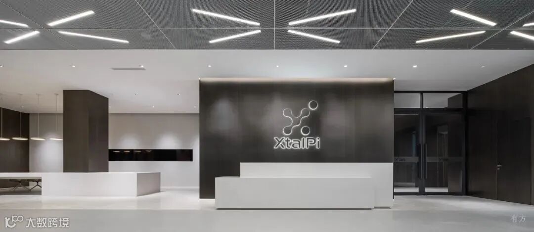 晶泰科技全球研发总部利用金属板、人造石、U型玻璃等材料构建空间,入口大厅的金属拉伸网天花吊顶,从入口一直延伸到办公区,吊顶内安装了线型照明,使公司标志的字母“X”柔和地出现。