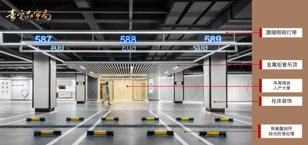 绿城的项目地下车库层高为3600mm时,主要车行道与地下门厅前采用栅吊顶装饰。绿城项目的吊顶材料为深咖色金属横条格栅,灯具隐藏安装格栅间,以暖黄色的筒灯与日光灯结合照明。