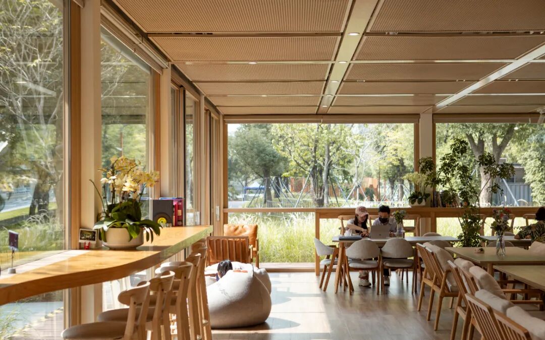 深圳大沙河公园滨水茶室在吊顶的处理上,为了更好地营造出茶空间的氛围,设计运用了木横梁搭配金属网帘的交织排布,巧妙隐藏机电管道的同时,也让通透的空间多了一份静谧。