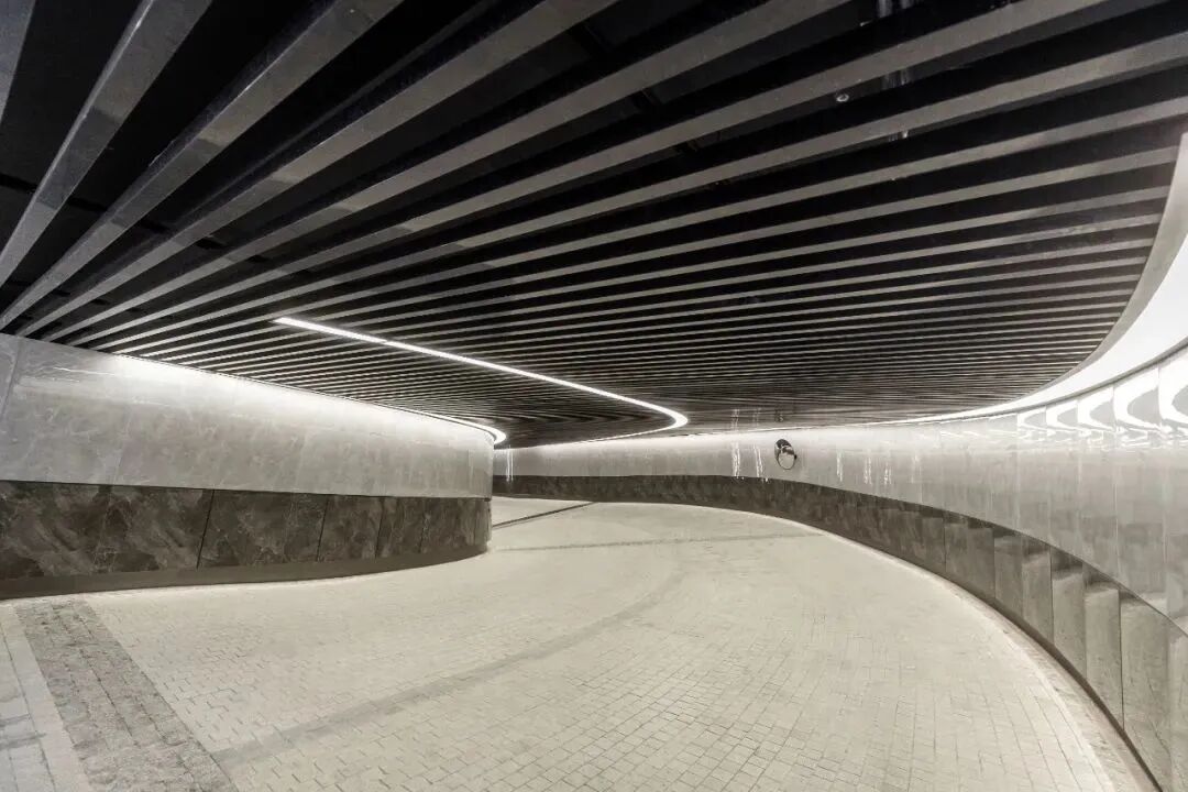 成都人居·九林语项目地下车库坡道,顶部由金属矩管吊顶、三条LED照明灯带镶嵌其中,质感十足。