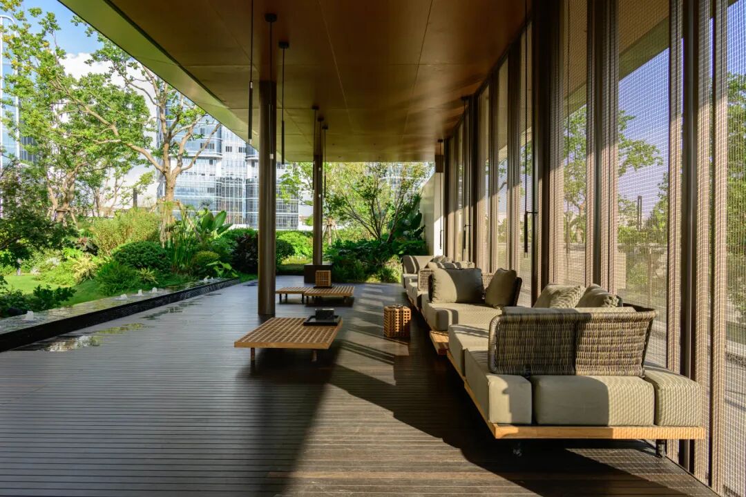 进入城市玄关,两侧曲面跌水将门廊的通过空间变得更具仪式感。借用传统水乡溪流过道,“千岩竟秀,万壑争流”,传达高雅的生活方式和精致的东方礼仪文化,营造出具有传统特色的酒店式入口氛围。