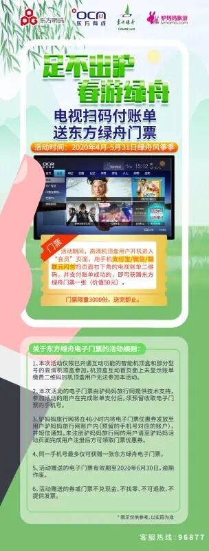 现在,高清机顶盒用户打开“会员”页面,通过电视扫码付账单,即可获得东方绿舟电子门票一张。首批门票总量3000张,兑完即止。