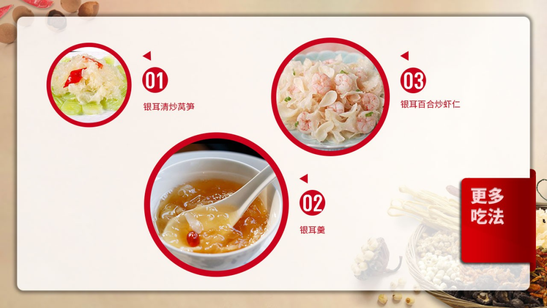 小小的丑银耳吃法多样,可以清炒莴笋,清淡营养;可以炖丑银耳羹,品尝原味,享受舌尖的丝滑;可以搭配百合炒虾仁,海陆结合,口感上乘。