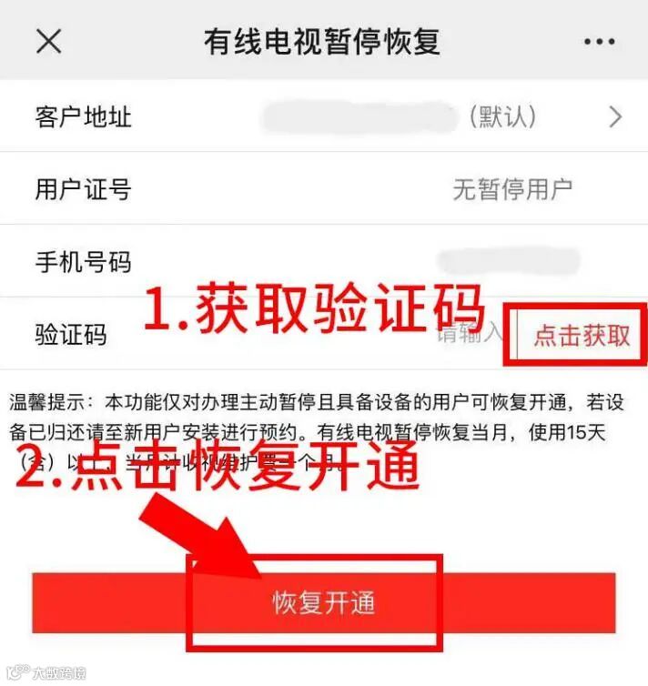 输入验证码后点选“恢复开通”按钮,即刻就能重新开通有线电视了。