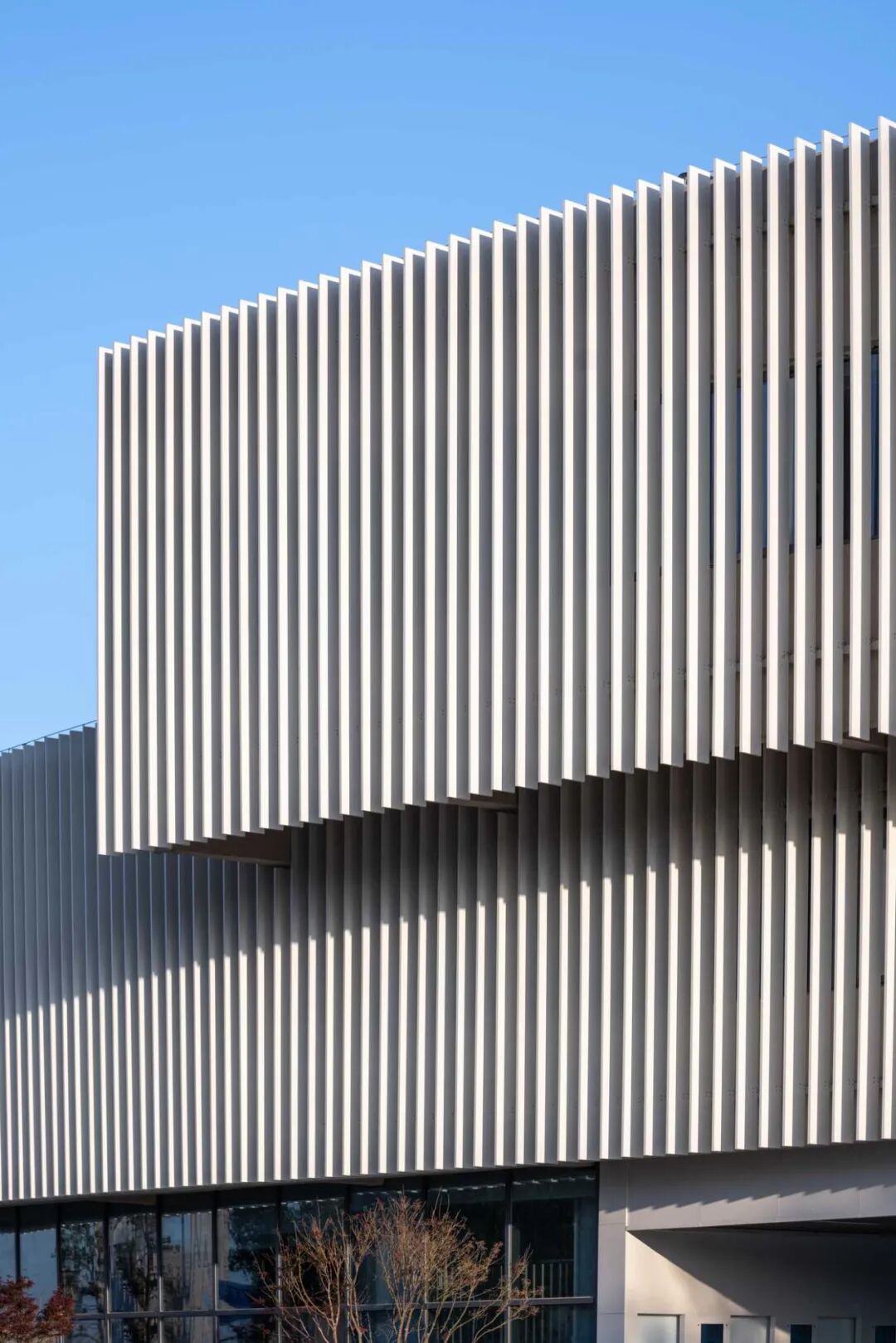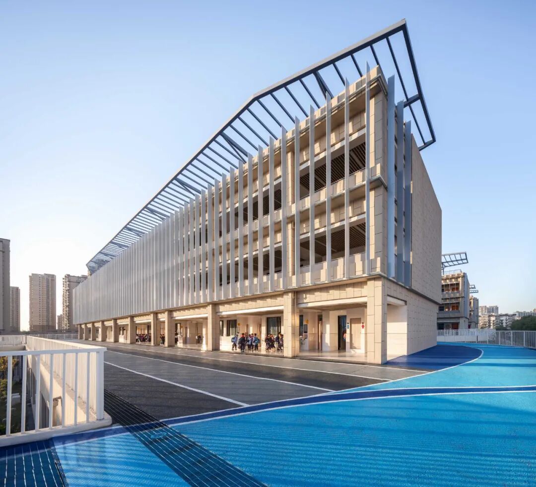 中小学教学楼中间设置综合教学楼,内设各类专用教室。教学单元均由简洁的矩形构成,立面使用竖向金属百叶形成统一的视觉形象。顶部的金属构件在起到造型作用的同时,也是为未来的扩建和拓展预留可能性。