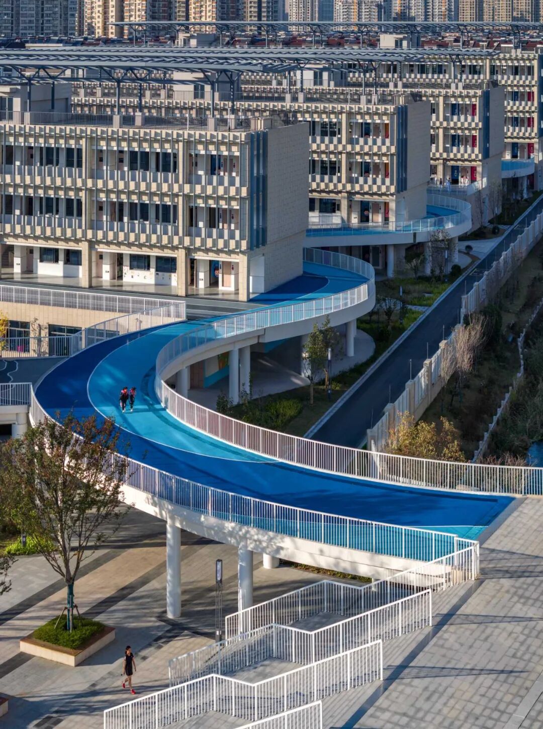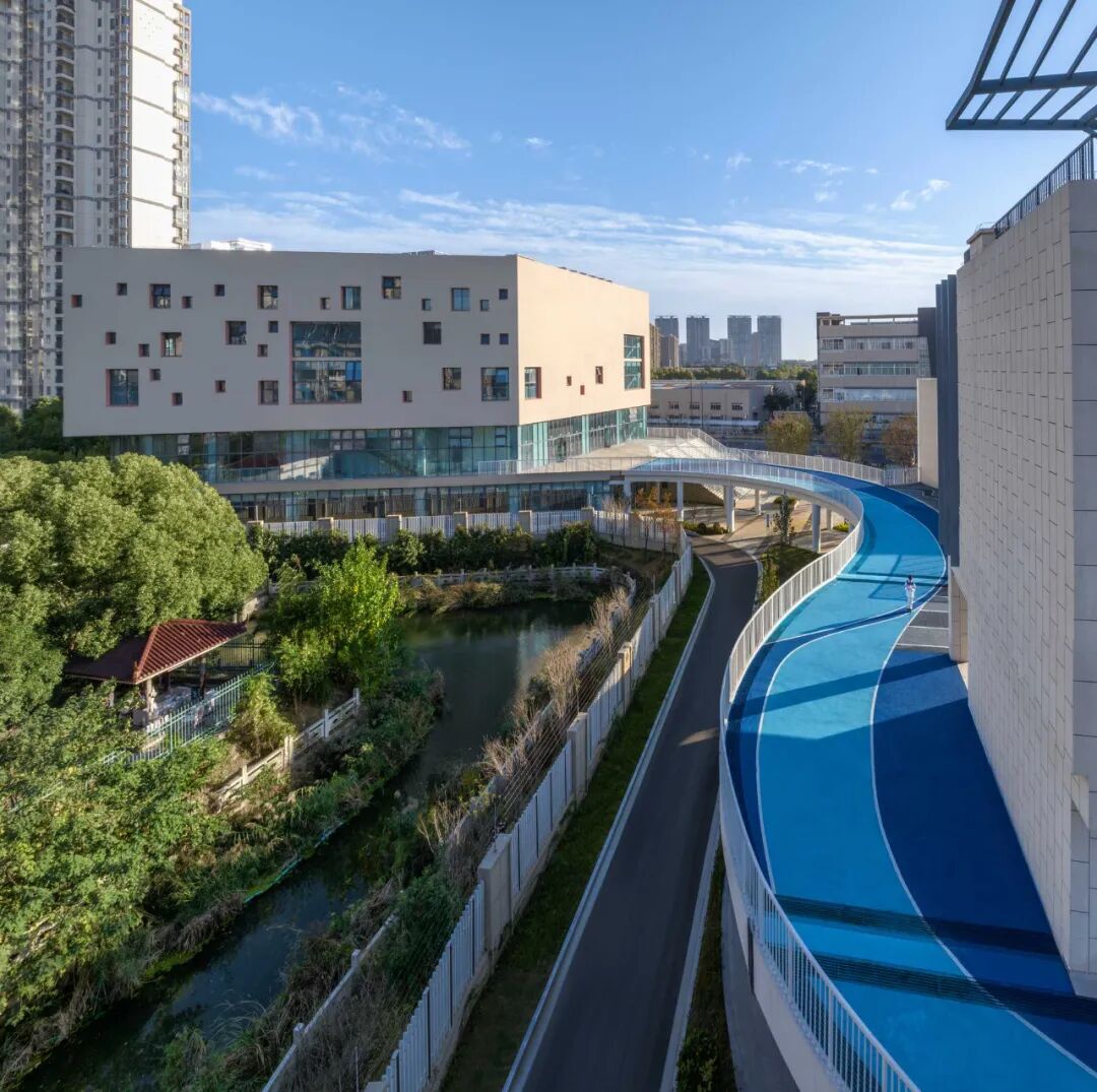 线性的曲廊穿梭在校园规则的块面布局之间,两个不同属性的图形,共同叠合出多层次的途径,诞生出了多元化的立体空间,这些被活化的空间成为了学生课间10分钟重要的放松活动场所。