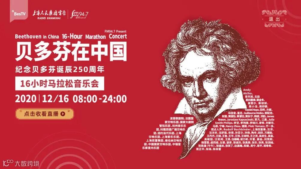 2020年是被称为“乐圣”、“交响乐之王”的著名作曲家贝多芬诞辰250周年,12月16日的纪念日当天,在东方有线点播平台将直播《贝多芬在中国——纪念贝多芬诞辰250周年16小时马拉松音乐会》。