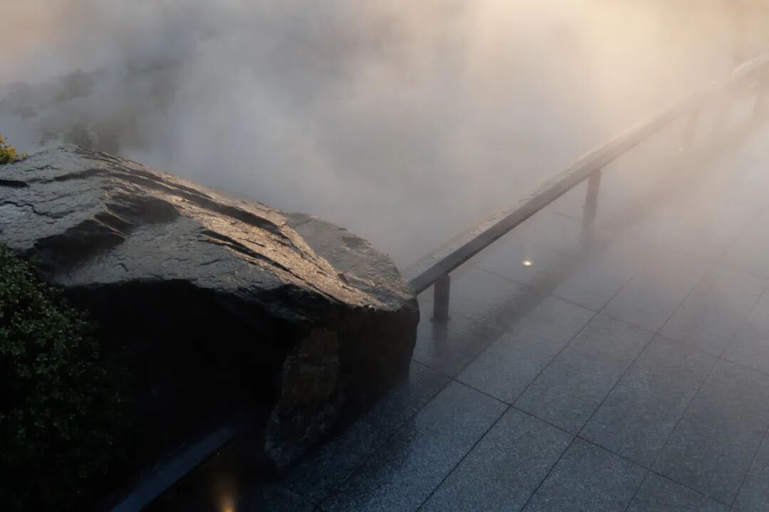 远处的景物隐没在水雾之中,树木的轮廓变得模糊而梦幻,整个世界都被笼罩在一层柔美的面纱之下。湖光山色,水流潺潺,营造出流光溢彩的画面,恍然间像是一幅“横看成岭侧成峰”的山水画,远近高低各具韵味,给人以无限遐想,心灵在这宁静的画卷中得以沉醉。