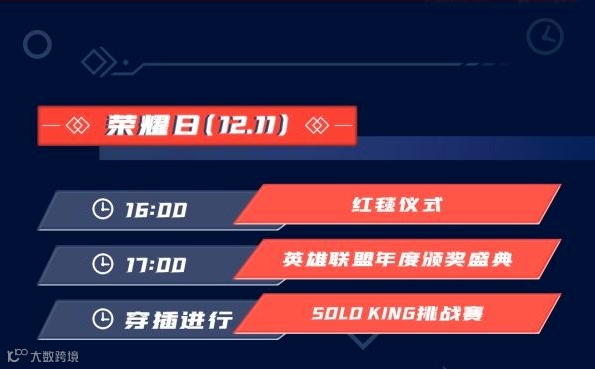 12月11日,全明星周末的荣耀日,嘉宾红毯仪式、英雄联盟年度颁奖盛典,同时SOLOKING挑战赛也会于当日穿插举行。今年SOLOKING挑战赛进行赛制调整,赛事采用1V1单淘汰规则,8名参赛选手进行对决,赛事全程,一个英雄只能使用一次。