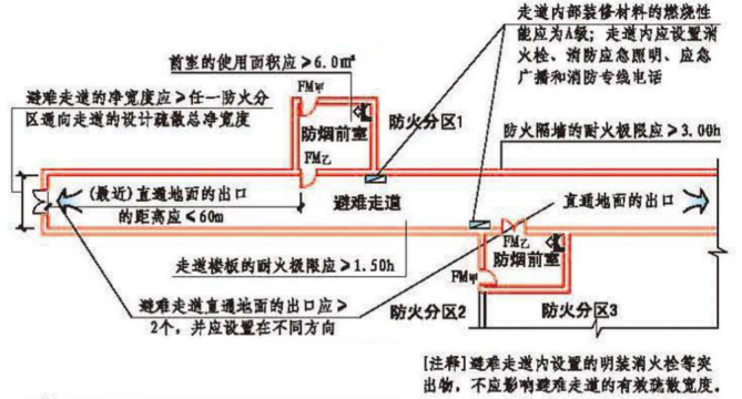 比如,下方,对于疏散走道两侧的隔墙,此处的墙体只有耐火等级要求,而未被定义成防火隔墙,因此此墙只需要满足耐火等级要求即可。