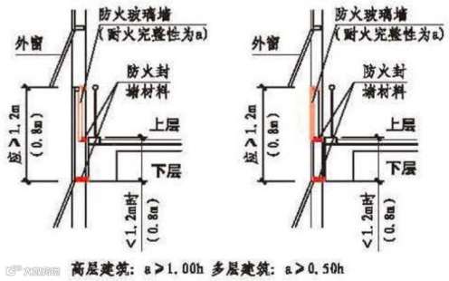 6.2.5 除本规范另有规定外,建筑外墙上、下层开口之间应设置高度不小于1.2m的实体墙或挑出宽度不小于1.0m、长度不小于开口宽度的防火挑檐;当室内设置自动喷水灭火系统时,上、下层开口之间的实体墙高度不应小于0.8m。当上、下层开口之间设置实体墙确有困难时,可设置防火玻璃墙,但高层建筑的防火玻璃墙的耐火完整性不应低于1.00h,多层建筑的防火玻璃墙的耐火完整性不应低于0.50h。外窗的耐火完整性不应低于防火玻璃墙的耐火完整性要求。…… (建筑设计防火规范)